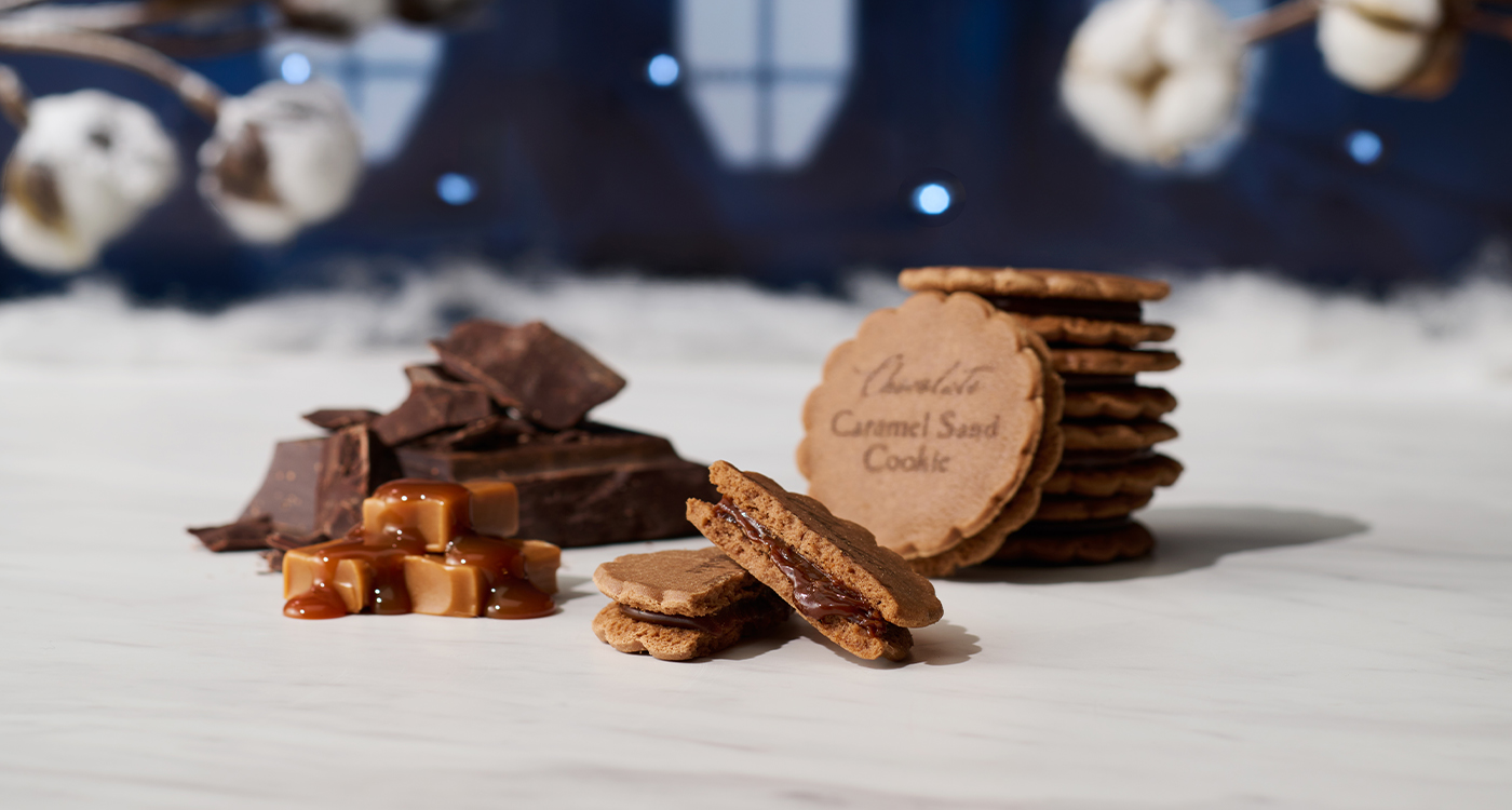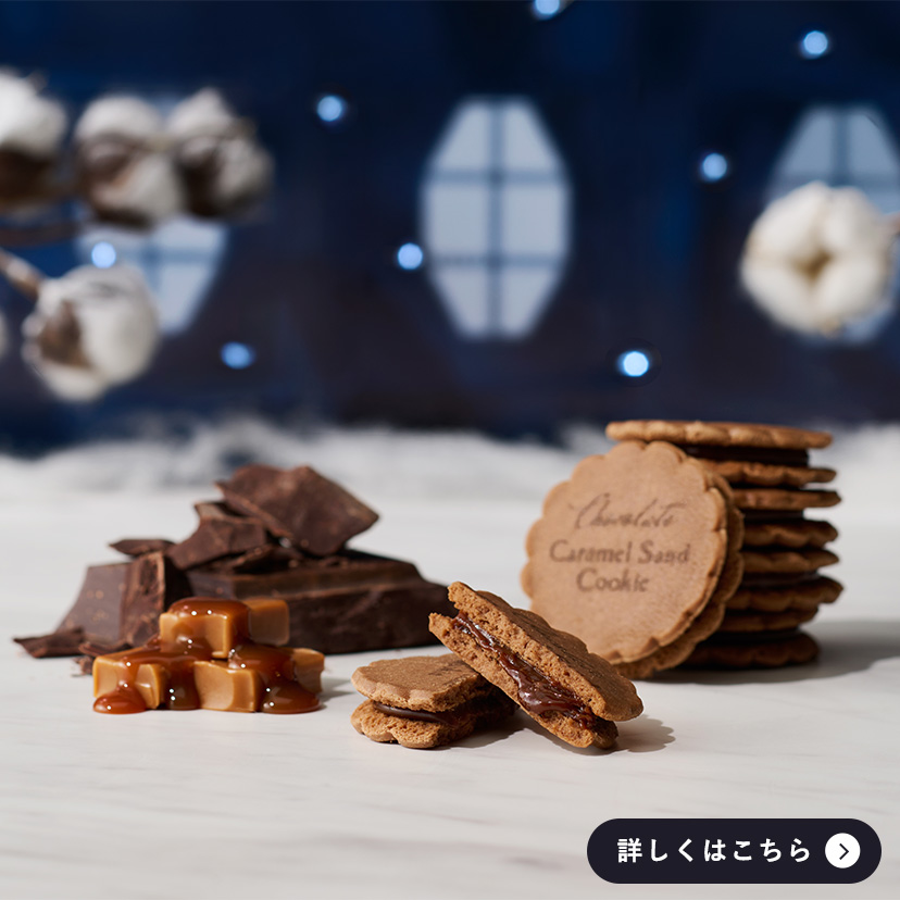 -Chocolate-キャラメルサンドクッキーショコラ丁寧に炊き上げたくちどけの良いキャラメルに、紅茶葉とショコラを加えて、深みのある味わいに仕上た一品。パッケージには、雪が降りしきる中、キャラメルオバケと愛猫メルちゃんが皆様のもとへ自慢のクッキーをお届けしている様子が描かれています。