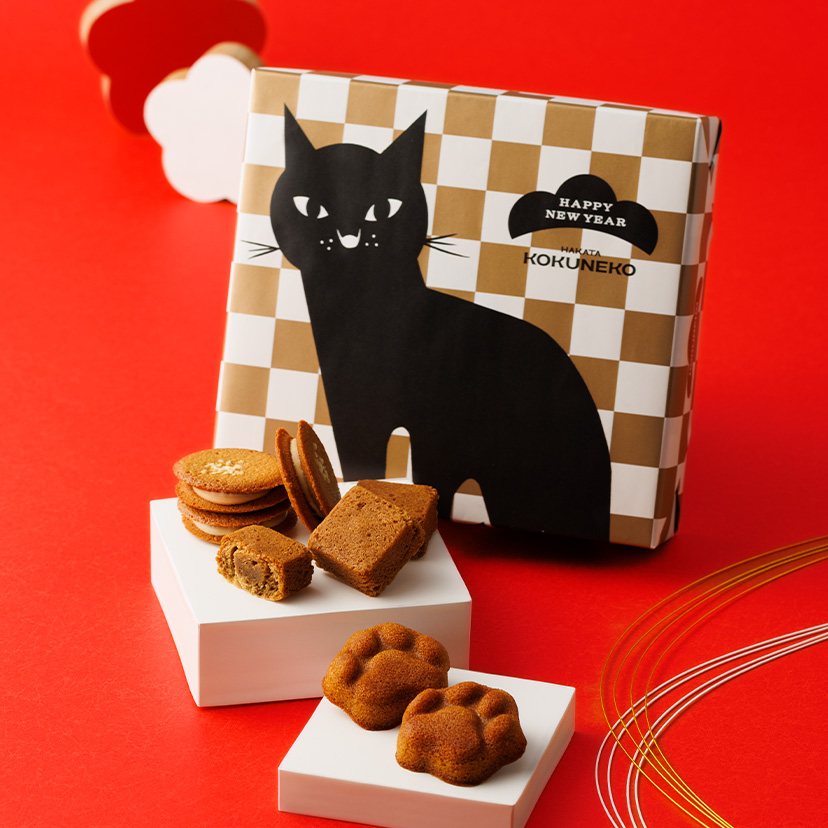 KOKUNEKO自慢のフィナンシェ、ガレット、チュイールを詰め合わせた迎春限定パッケージです。 黒糖を模した市松模様は、途切れることなく柄が続くことから「繁栄」「発展」「永続性」を象徴する縁起柄とされています。 「今年も良い年になりますように」と願い、猫好きの方にはもちろん、新年のご挨拶にもおすすめです。