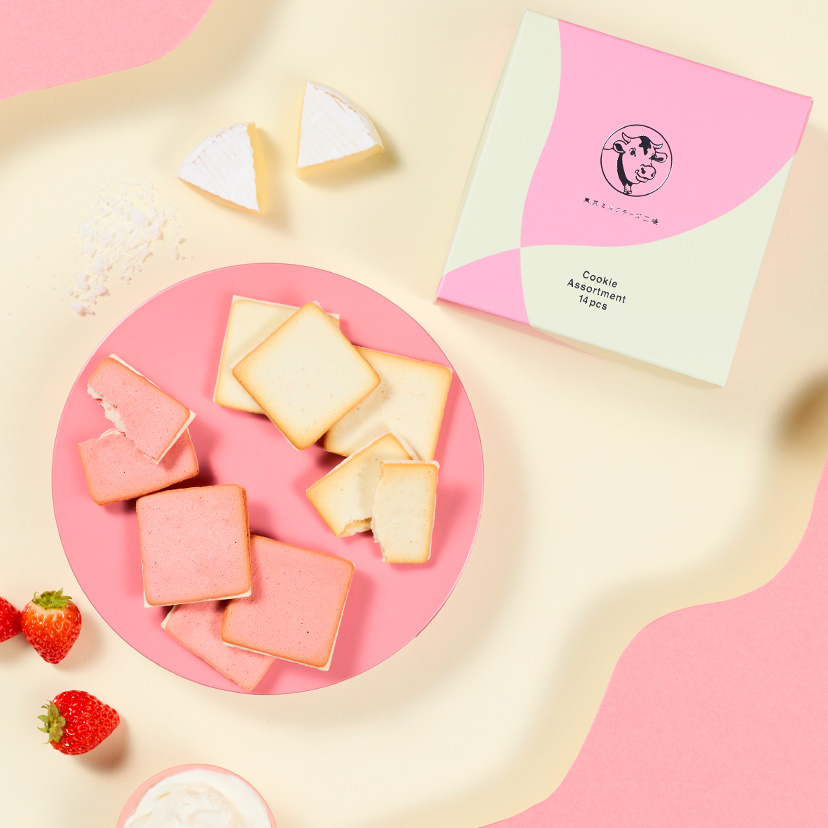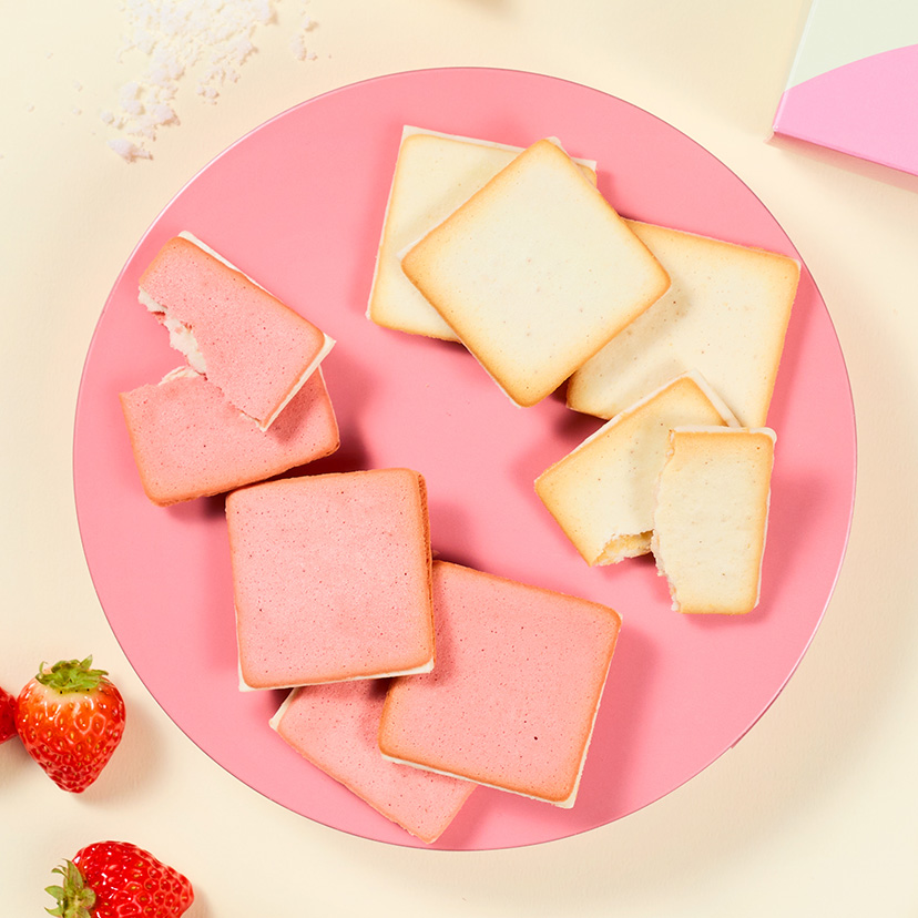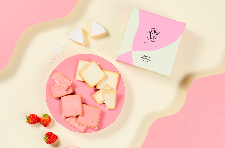 不動の人気No.1「ソルト&カマンベールクッキー」と、袋を開けた瞬間にふわっと広がるいちごの香りと、ピンク色が愛らしい期間限定味「ストロベリー&マスカルポーネクッキー」の2種類をお楽しみいただける詰合せです。