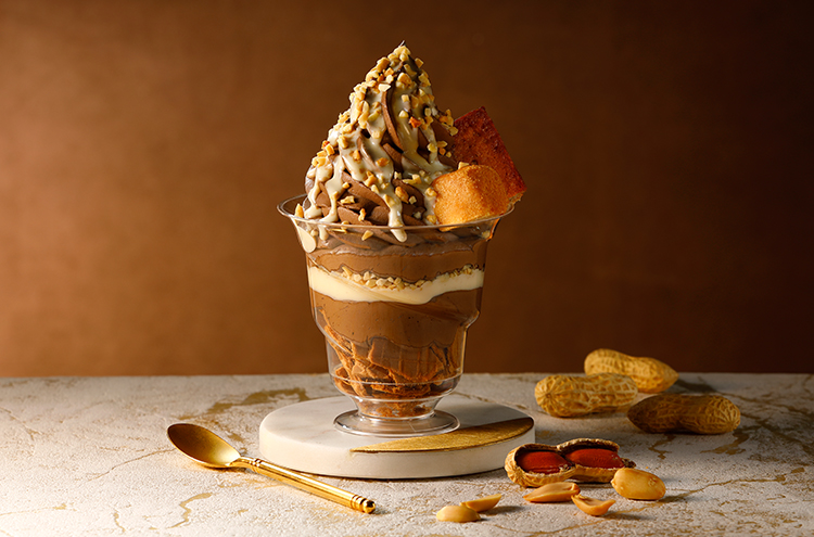 一口頬張ってみると、チョコレートソフトクリームの濃厚さに驚き!トップだけでなくセンターにも八街産ピーナッツダイスやピーナッツペースト入チョコレートソースを散らし、底にはサクサクワッフルコーン。食べ進めていくといろいろな食感をお楽しみいただけます。