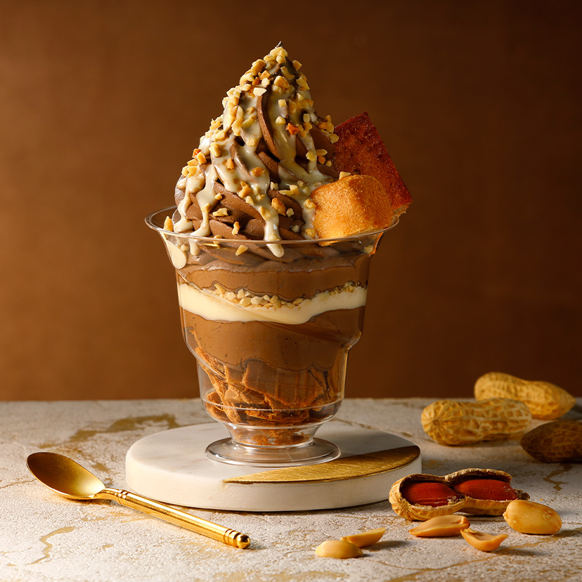 トッピングは人気商品の「ドレ・フィナンシェ」「ドレ・ガレット キャレ」。風味豊かなピーナッツになめらかでコクのあるソフトクリームが口の中で絶妙なハーモニーを奏でます。