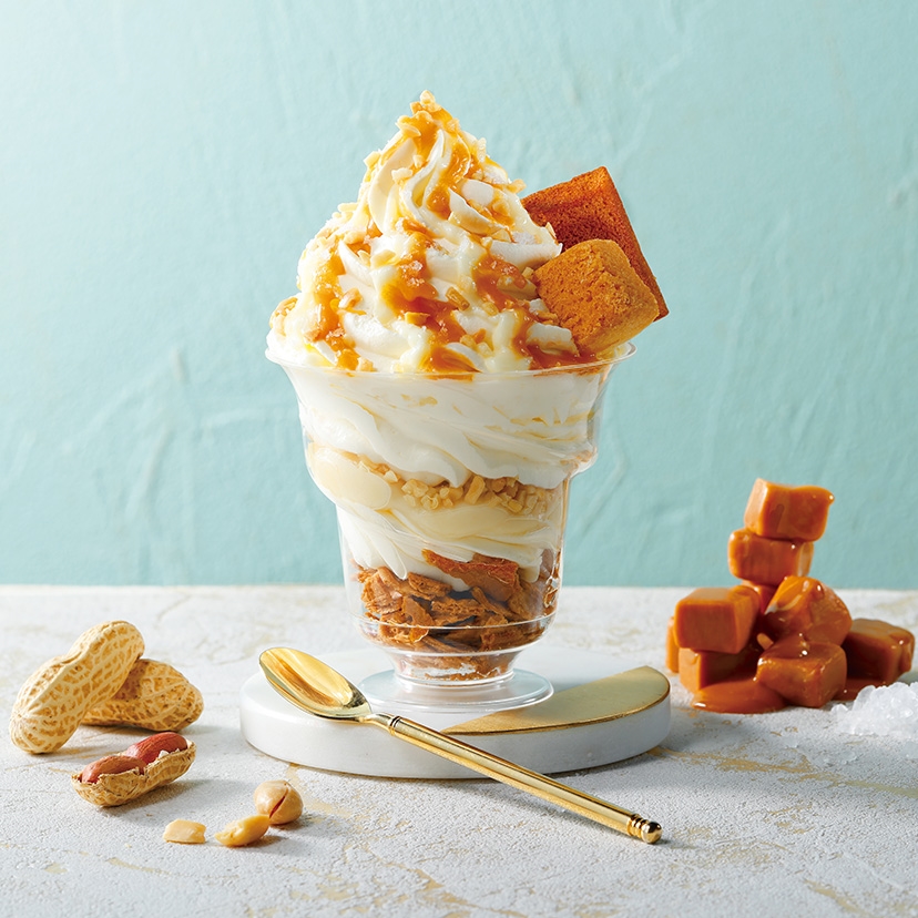 ドレから八街産ピーナッツを使用したドレ・塩キャラメルサンデーをお届けいたします。トップだけでなくセンターにも八街産ピーナッツダイスやピーナッツペースト入チョコレートソースを散らし、底にはサクサクワッフルコーン。程よい塩味がキャラメルのコクやソフトクリームの甘味を引き立て、食べ進めていくといろいろな食感をお楽しみいただけます。トッピングは人気商品の「ドレ・フィナンシェ」「ドレ・ガレット キャレ」。風味豊かなピーナッツになめらかでコクのあるソフトクリームが口の中で絶妙なハーモニーを奏でます。
