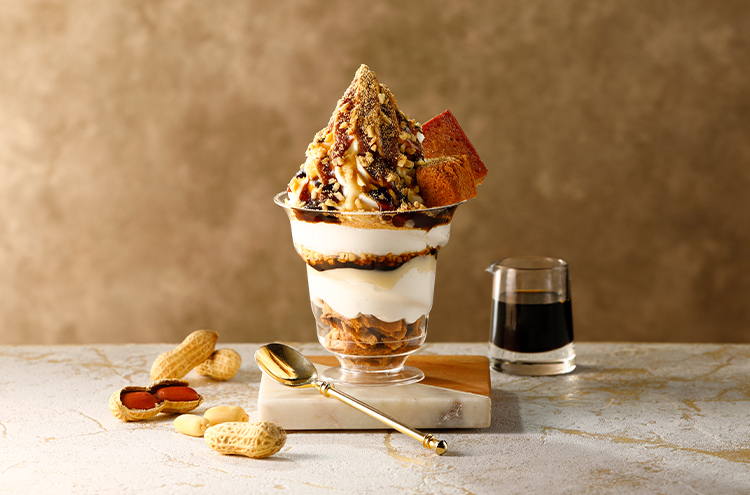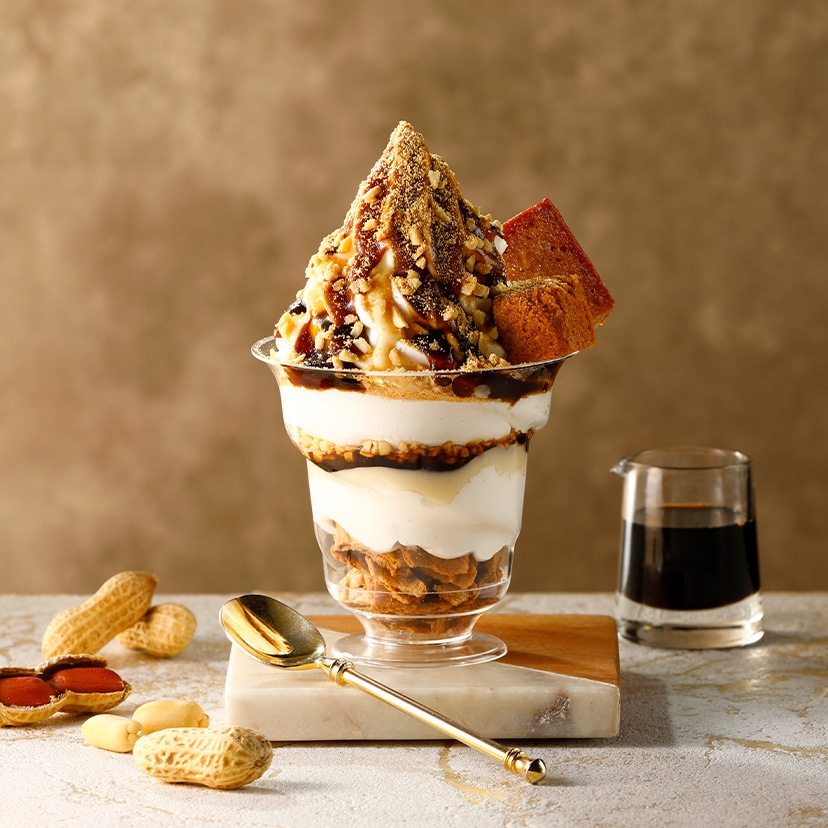 なめらかでコクのあるミルクソフトクリームに、黒蜜の豊かなコクときなこの風味がよく合います。 八街産ピーナッツダイスやピーナッツペースト入りチョコレートソースで華やかにデコレーションし、底にはサクサクのワッフルコーンを敷きました。