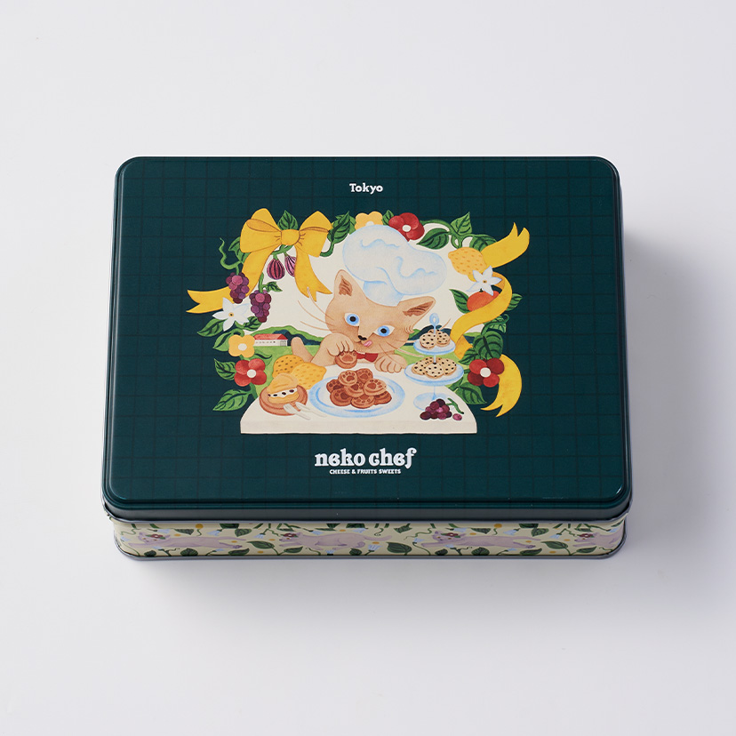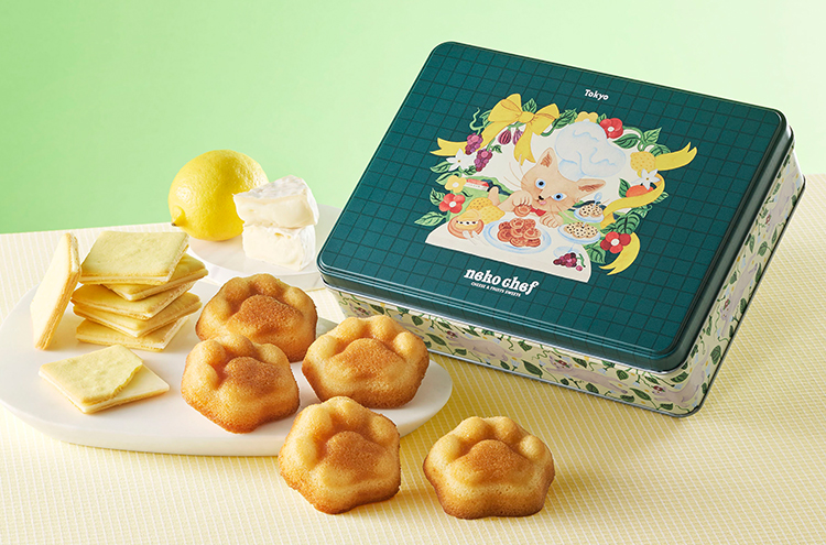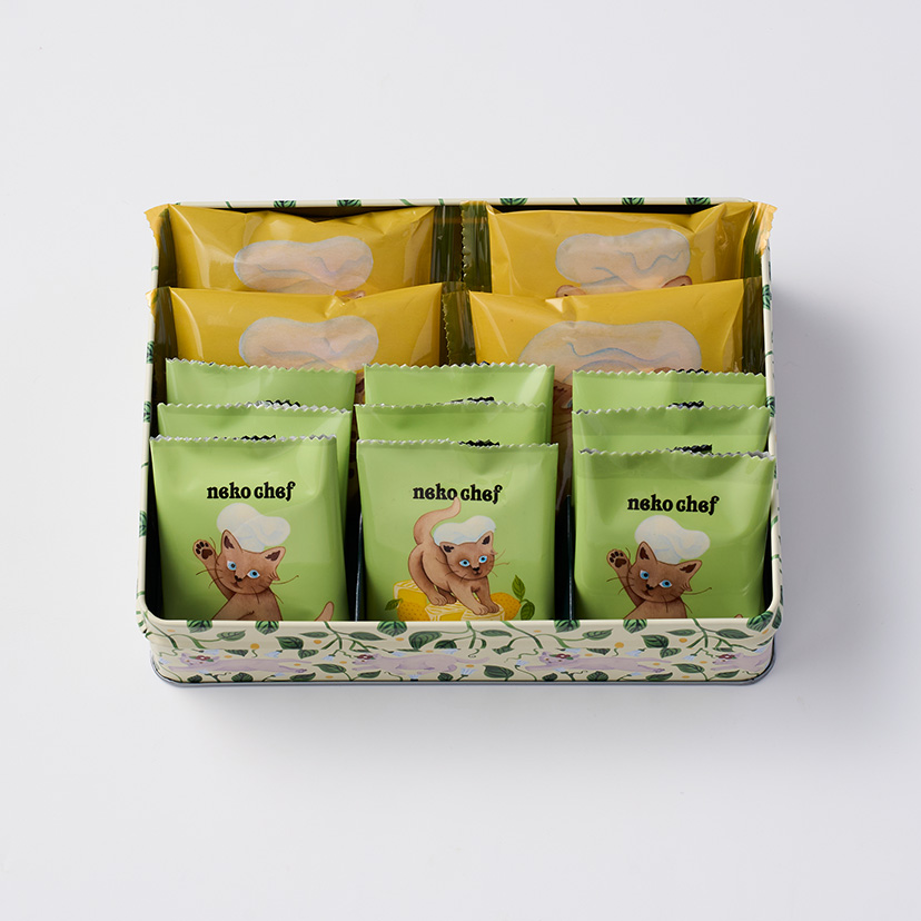 カマンベールを練り込んだ薫り豊かな生地に、レモンピールを加えた爽やかな味わいの「フィナンシェ」と、北海道産牛乳とレモンを合わせたクッキー生地に、カマンベールチーズのチョコ※をサンドした「サンドクッキー(カマンベール&レモン)」二種の詰合せ。 ※チョコレートコーチングを使用(チーズ中カマンベール73%使用) 缶の天面には、「いまかいまか」とソフィちゃんの到着を待ちわびるネコシェフ。側面にはネコシェフのおかしを楽しみにしているソフィちゃんの様子が描かれています。 2匹の気持ちが交差する、そんな遊び心とおいしさがたっぷり詰まったネコシェフ缶。