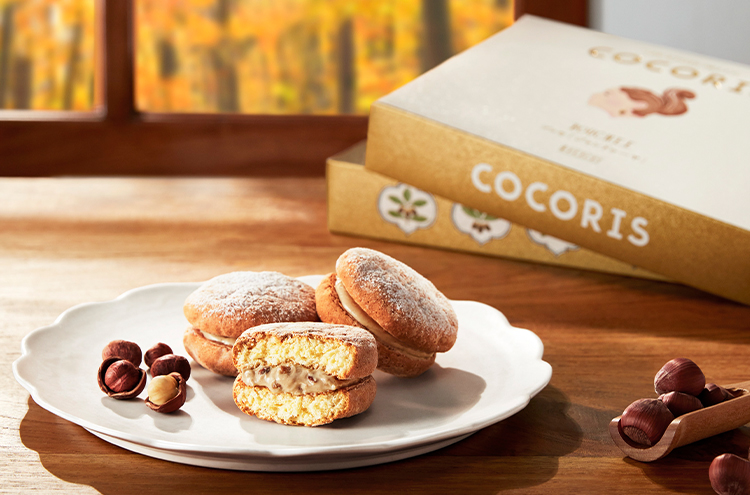 ふんわりと焼き上げたブッセ生地にココアバターとヘーゼルナッツで口どけなめらかに香ばしく仕上げたジャンドゥーヤクリームをサンドしました。