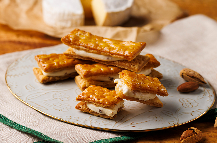 黄金色に焼き上げたサクサク食感のパイ生地で、カマンベールクリームをサンドしました。クリームは、カマンベールの風味と塩味のバランスにこだわり、さらにアーモンドダイスの食感を加えて仕上げました。サクサクと食べ進めるたびに広がるやさしい甘さとコクに、アーモンドの風味が重なる、素朴でやさしい飽きの来ない味わいです。