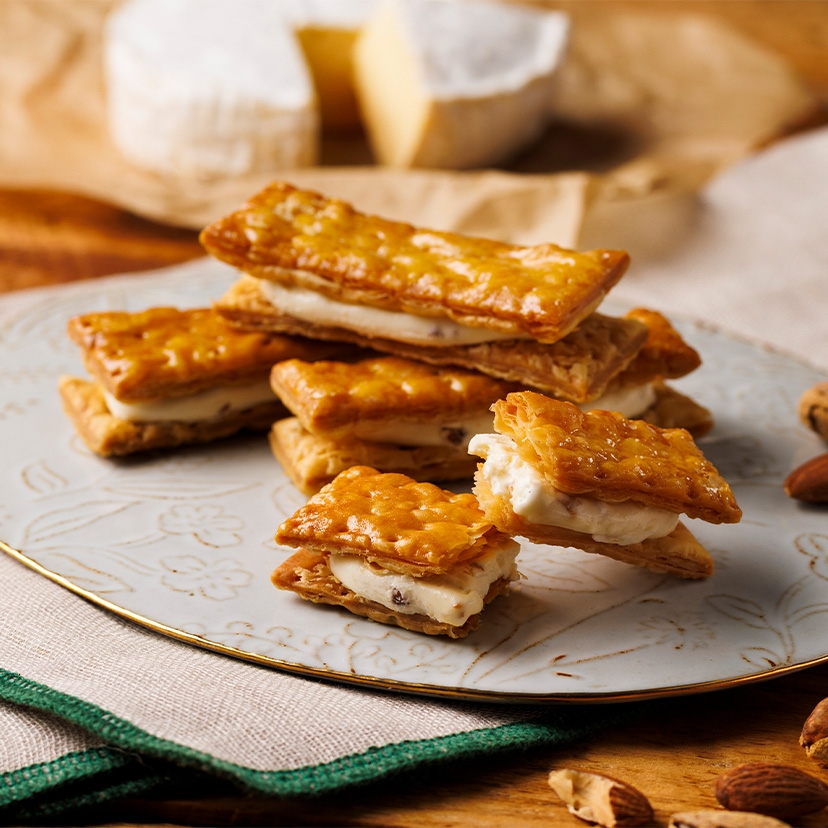 黄金色に焼き上げたサクサク食感のパイ生地で、カマンベールクリームをサンドしました。