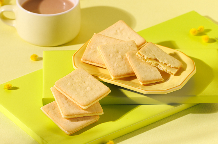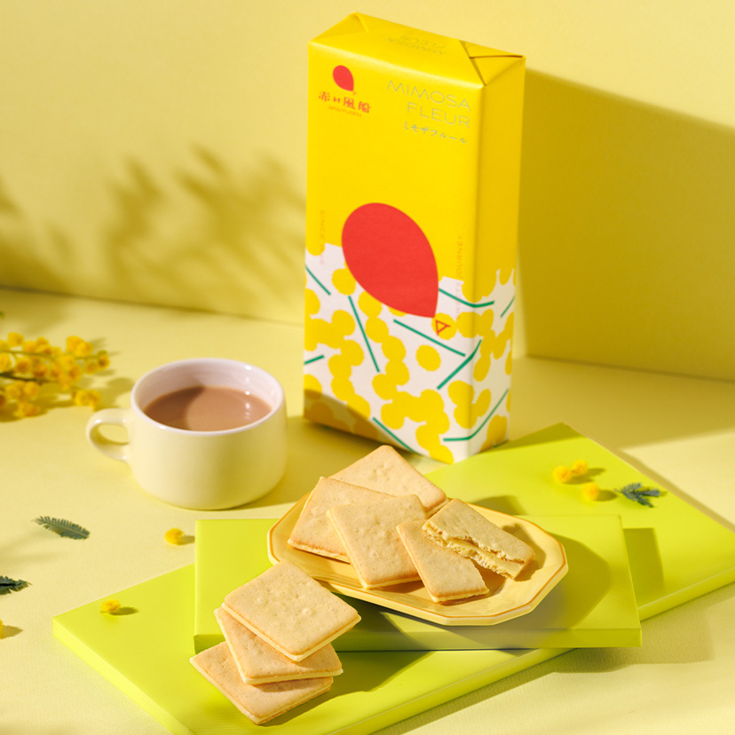 ミルキーなクリームチーズ風味のチョコ※をサクッと軽い食感のチーズクッキーでサンド。 ミモザの花のように黄みがかった焼き色が特長です。 ※チョコレートコーチングを使用
