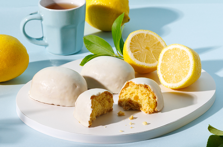 細かく刻んだレモンピールを生地に練り込み、レモン風味のチョコをかけたレモンケーキ。