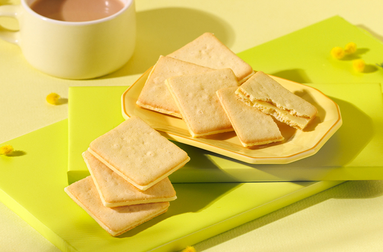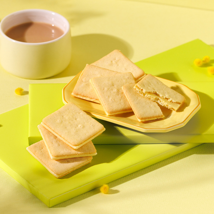 ミルキーなクリームチーズ風味のチョコ※をサクッと軽い食感のチーズクッキーでサンド。 ミモザの花のように黄みがかった焼き色が特徴です。 ※チョコレートコーチングを使用