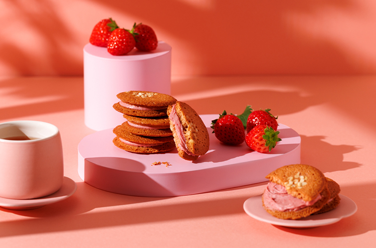 発酵バターやいちごペーストを練りこみ、風味豊かに、そして繊細な食感に仕上げたチュイール。あまおう苺の程よい酸味が調和した、口どけなめらかなチョコレート。そして、トッピングのアーモンドが食感と味わいにアクセントを添えます。素材の魅力が折り重なるように広がる味わいが、甘くてやさしい癒しのひとときをお届けします。