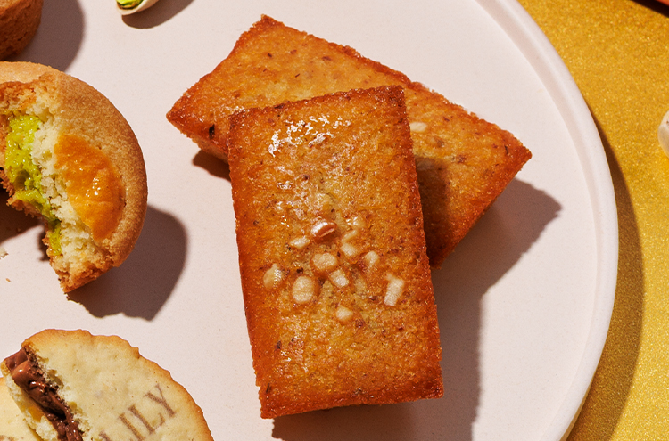 じゅわっとあふれるバターの濃厚な味わいと、香ばしいヘーゼルナッツのマリアージュが楽しめるフィナンシェ。