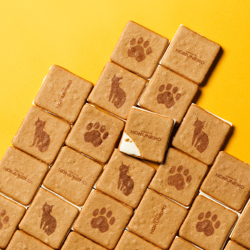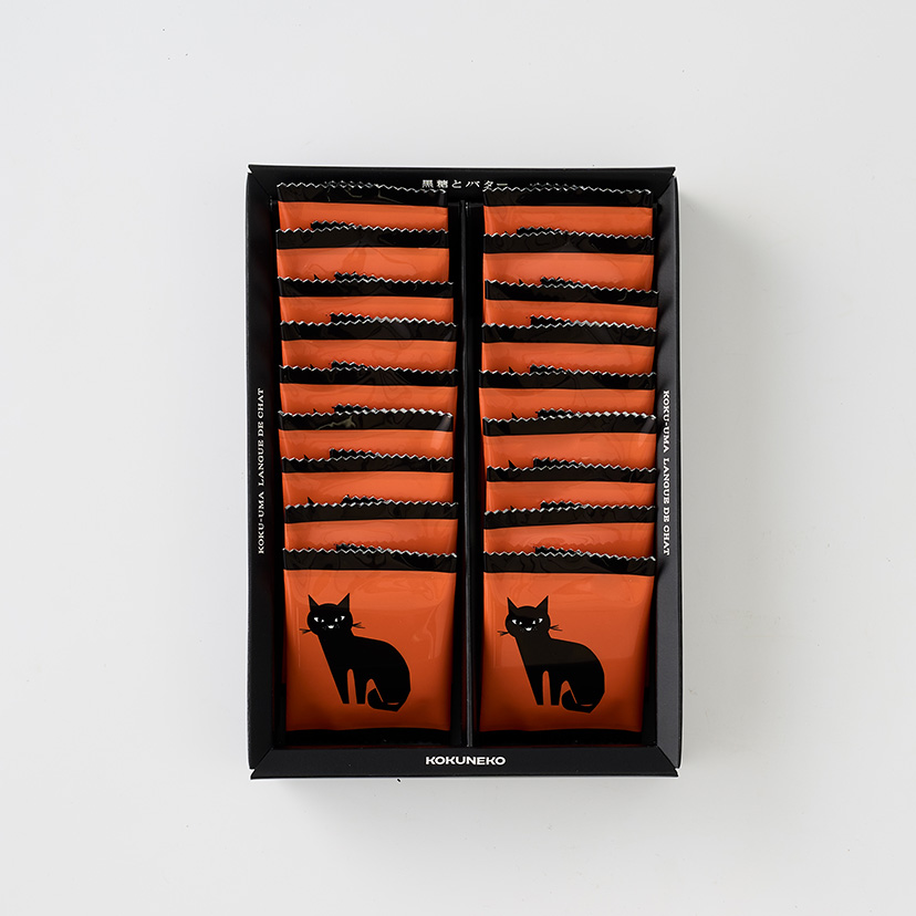 黒糖とグラスフェッドバターを練り込んだ生地を軽やかに焼き上げ、バター風味のチョコをサンドしたラングドシャです。 黒糖のやさしい甘みとバターのコクが重なり合い、奥行きのある味わいに仕上げました。 天面にはコクネコや肉球をあしらい、愛らしさの中に遊び心を添えたKOKUNEKOらしい一品です。 ※バター中グラスフェッドバター90%使用 グラスフェッドバターとは、放牧酪農により飼育された乳牛のバターです。牧草主体で育ち、飼料は補助的な使用にとどめています。 ※チョコレートコーチング使用