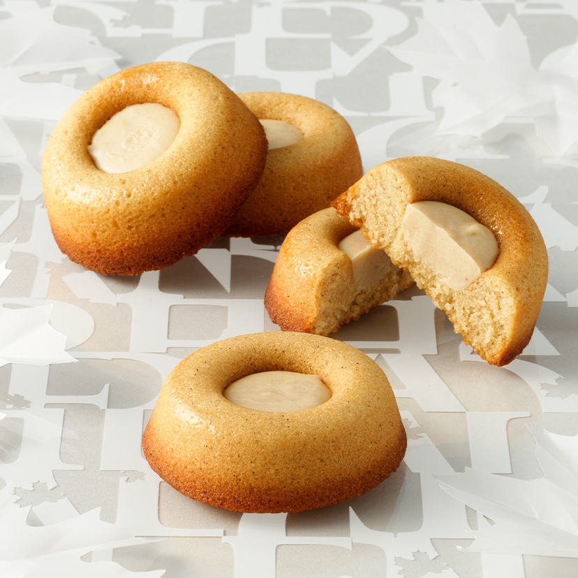 仕上げに中央のくぼみを、メープルチョコレートで満たしました。 ひと口目からメープルの穏やかな甘さとチョコレートのまろやかなコクが重なり合い、心地よい余韻を残します。