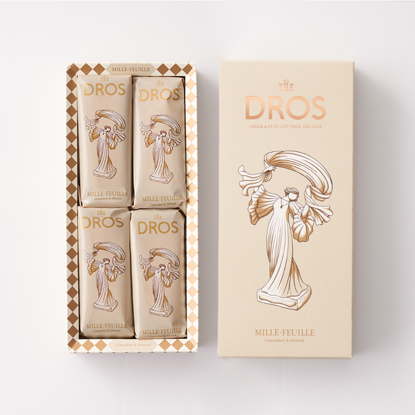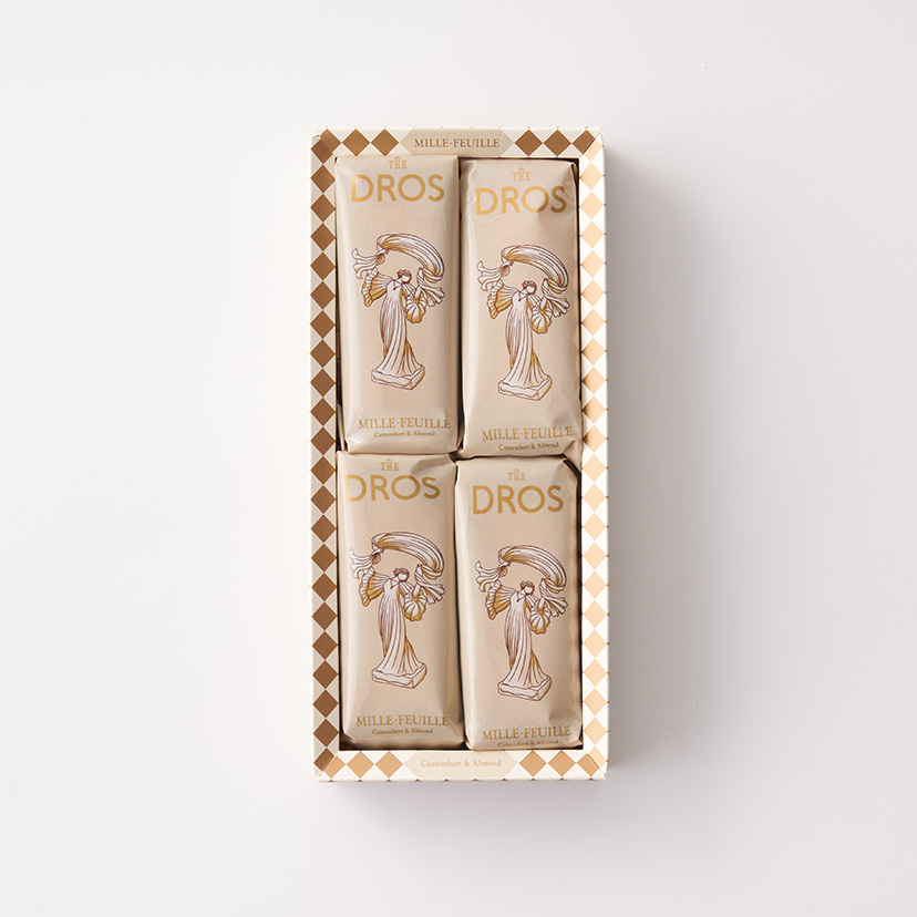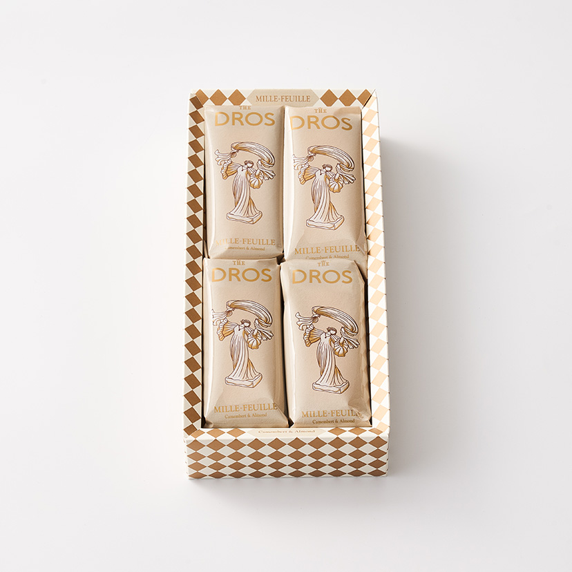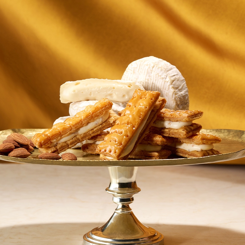 黄金色に焼き上げたサクサクのパイ生地とカマンベールクリームで仕立てたミルフィユ。 カマンベールの風味と塩味のバランスが特徴のクリームは、アーモンドダイスの食感がさらなるアクセントとなり、味わいや食感を愉しめる逸品です。 (チーズパウダー中カマンベール75%以上使用)
