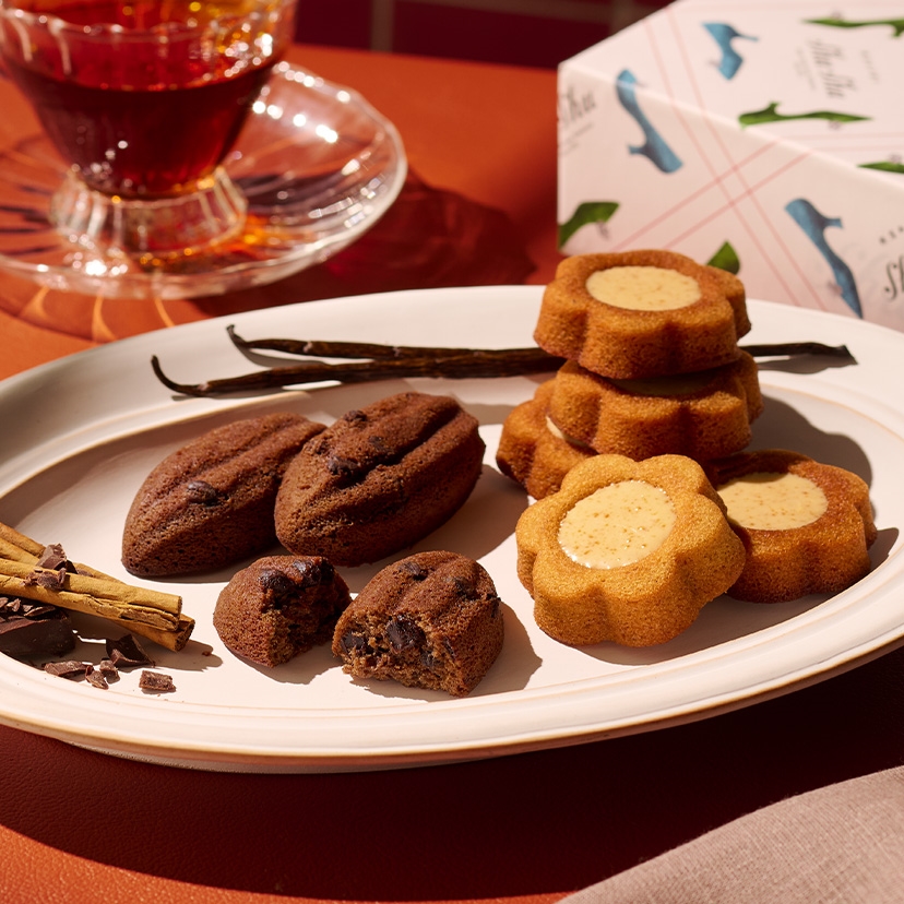個性豊かなケーキとフィナンシェ。 ShuShuの世界観を色濃く堪能できる特別なセレクションです。バニラとキャラメル、シナモンとカカオ。 それぞれが織りなすマリアージュを一度にお楽しみいただけます。