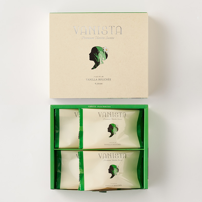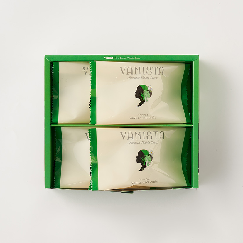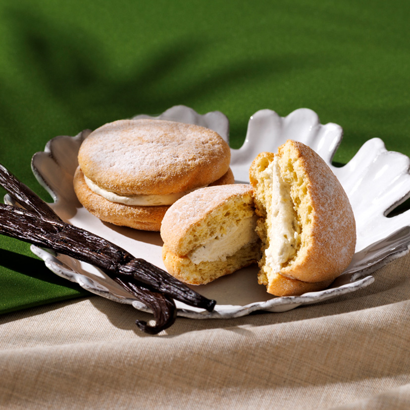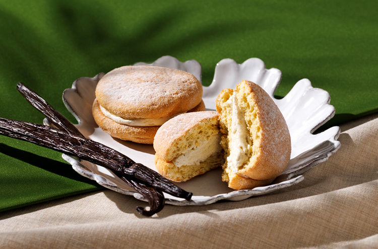 タヒチ産バニラと北海道産小麦のふんわりと軽やかな生地で、グラスフェッドバターとバニラで仕立てたコク深いバニラクリームをサンドしたブッセ。