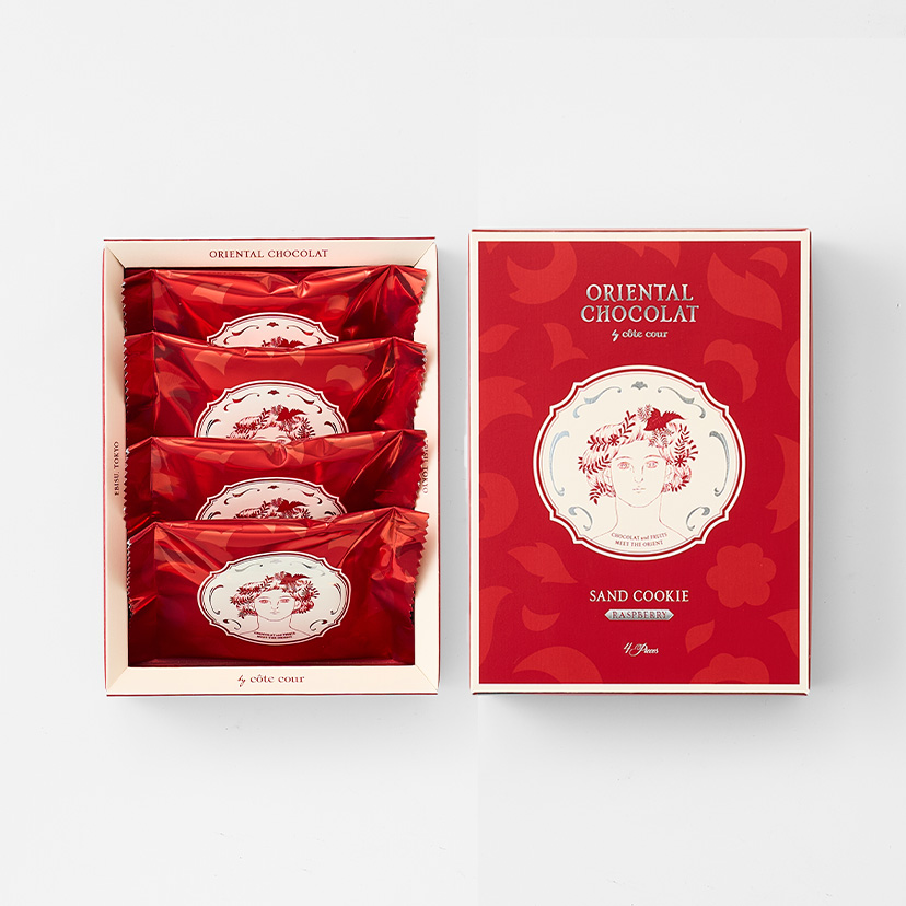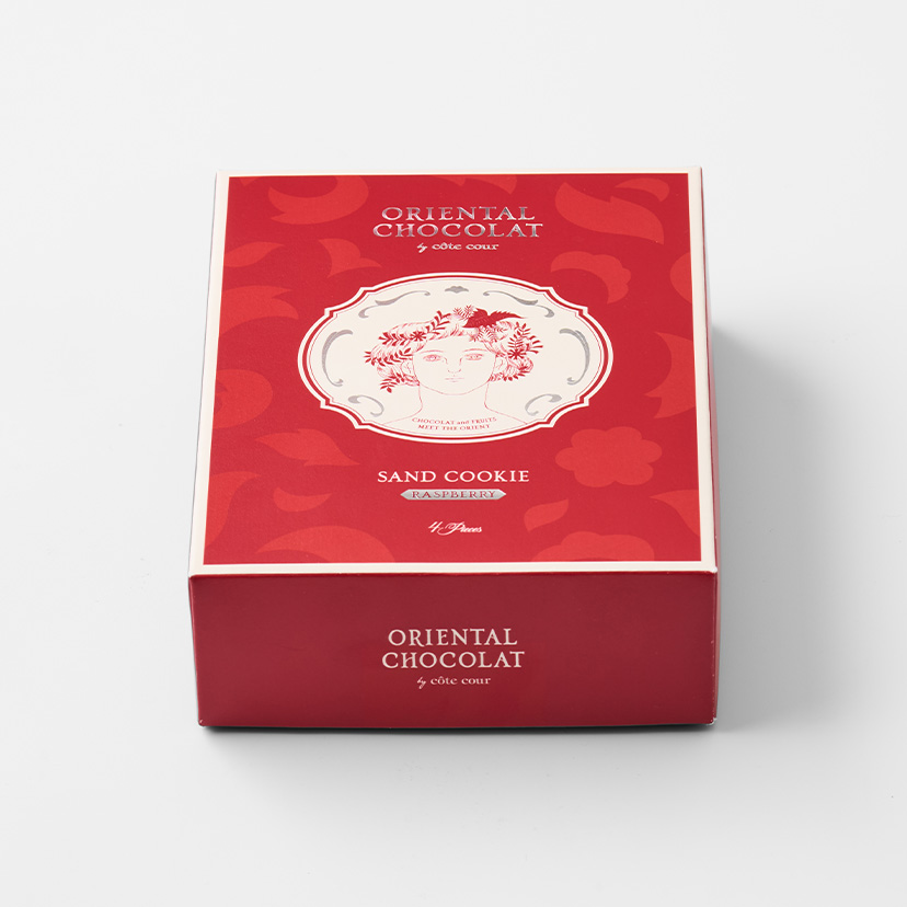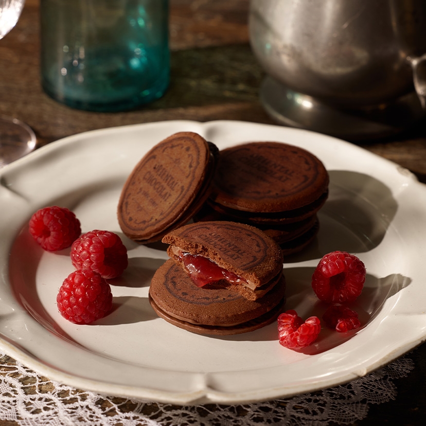 風味豊かなラズベリーソースを、ミルクチョコレートでコーティングし、ココアクッキーでサンドした、贅沢な味わいのサンドクッキーです。 濃厚なチョコレートの風味と、ラズベリーの爽やかな酸味のコントラストをお楽しみいただけます。