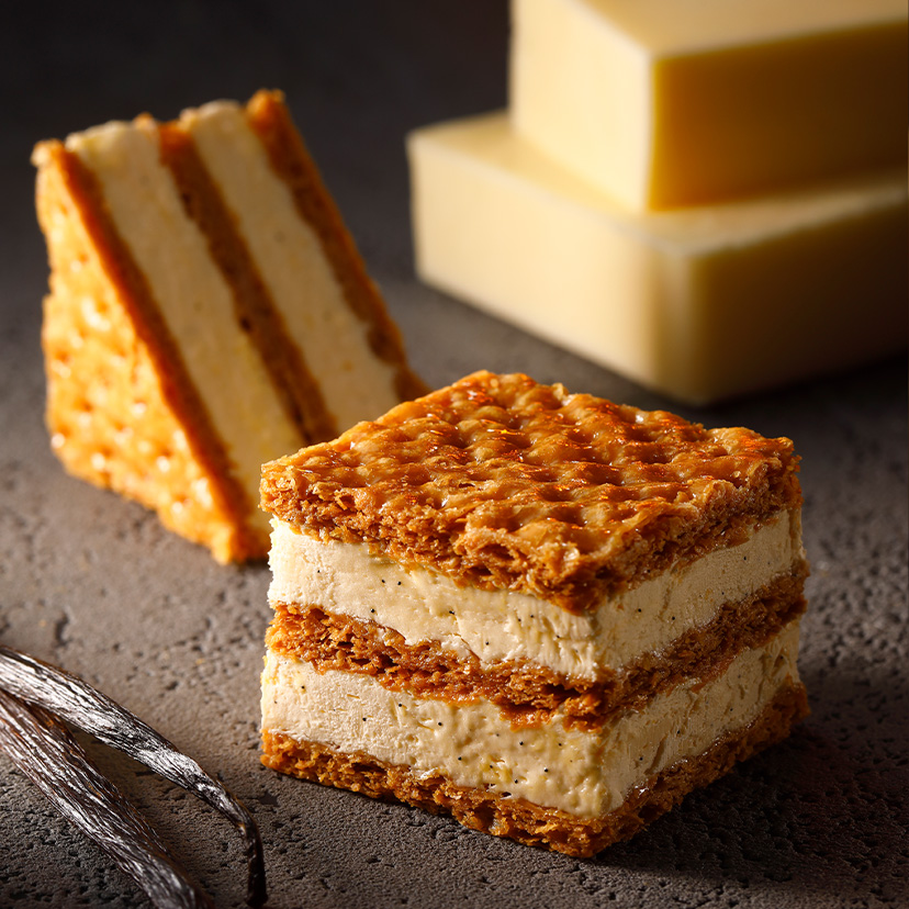 厳選したフランスブルターニュ産発酵バターとカスタードを合わせたムースリーヌを、さっくり焼き上げた生地でサンドしました。バニラの上品な香りがバターのコクをより一層引き立たせる逸品です。