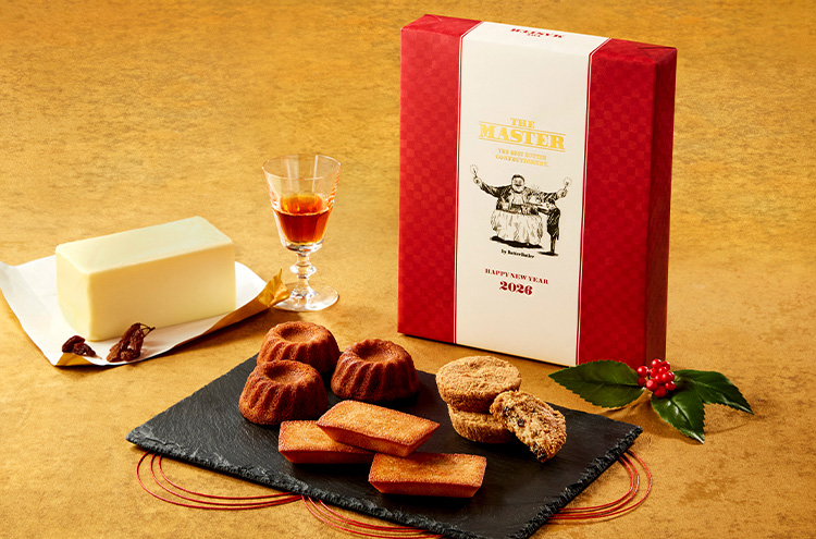 ザ・マスター自慢の焼き菓子3種をお楽しみいただける詰合せを “迎春限定パッケージ”に包んでご用意いたしました。 モンテギューA.O.Pバターを惜しまずたっぷりと使い、丁寧に焼き上げた「バターフィナンシェ」の他、メープルの甘みとラムレーズンの酸味が効いた「ラムレーズンバタークッキー」、ホワイトチョコレートとブラウンシュガーがコクとうまみを演出する「ラムレーズンバターケーキ」をお楽しみいただけます。 「発展」や「繁栄」を意味する市松模様を使い、箔で華やかさをプラスした限定パッケージ。大切な人への贈り物にぴったりの特別な一箱です。お世話になった方への感謝の気持ちを込めた贈り物に、年始の大切な方へのご挨拶にいかがでしょうか。数量限定商品の為、ぜひお見逃しなく。