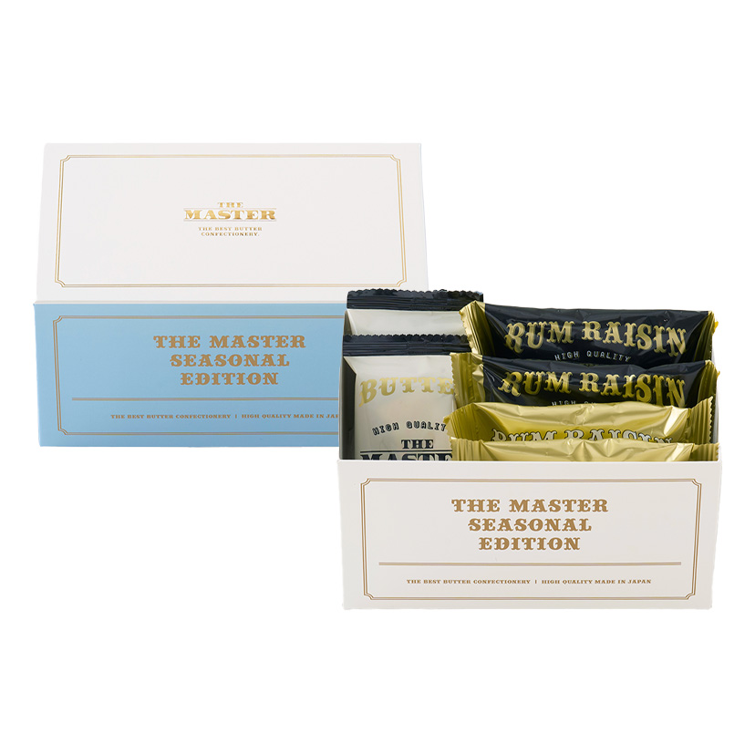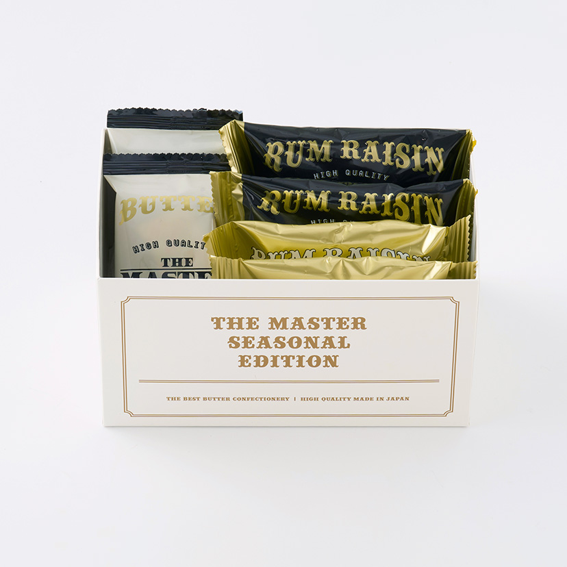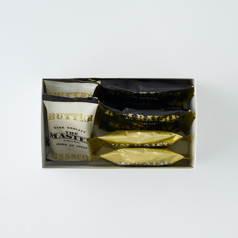 期間限定のパッケージでご用意した、「バターフィナンシェ」、「ラムレーズンバタークッキー」、「ラムレーズンバターケーキ」の3種詰合せ。