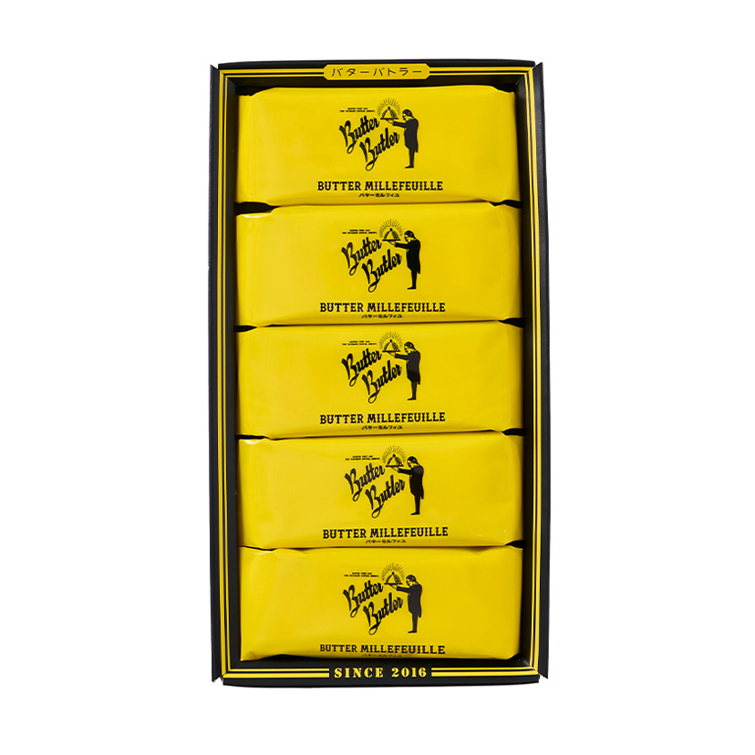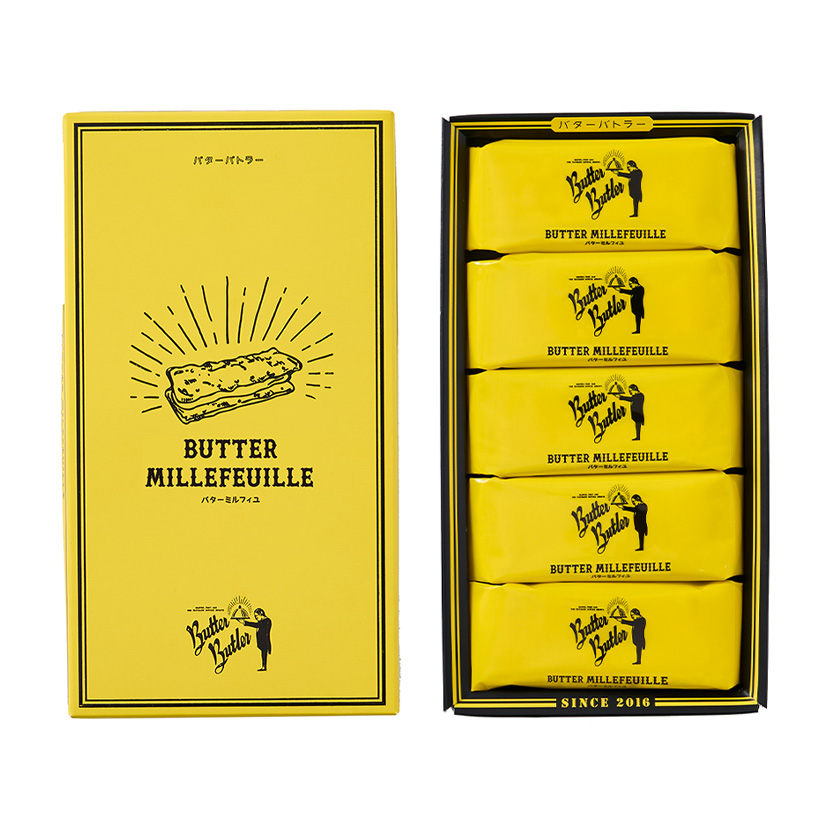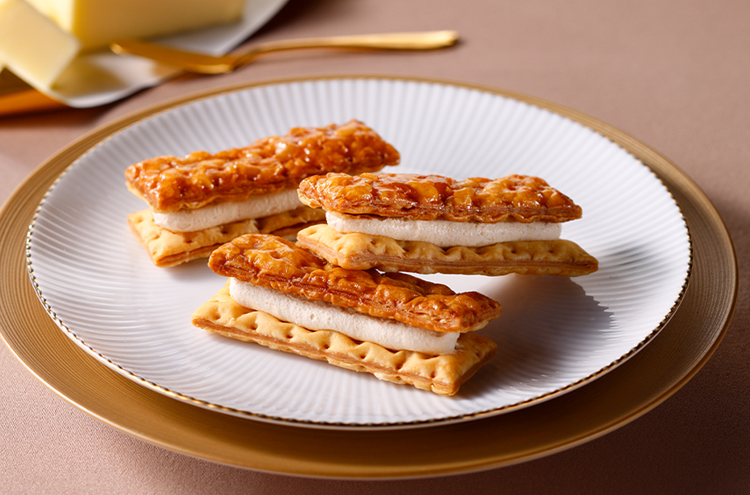 パイに挟んだバタークリームは、ヨーロッパでつくられた発酵バターで仕立てたこだわりの味わい。キャラメリゼして黄金色に焼き上げたサクサクのパイとの相性は抜群で、サクッと軽い食感の中に感じられるコクと香りが絶品でございます。