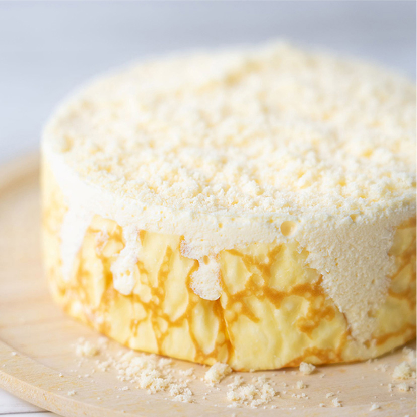 口の中でとろけるムースを最大限活かすために、ケーキ全体を薄く口当たりの良い「クレープ生地」で包むことで、ミルクチーズケーキ本来の風味を優しくまとめ上げています。ケーキの上にクラム生地を散らしたこともポイント。細かなクラム生地がムースのくちどけを決して邪魔せず、最後のひとくちまで「極上のほわほわ食感」が続きます。