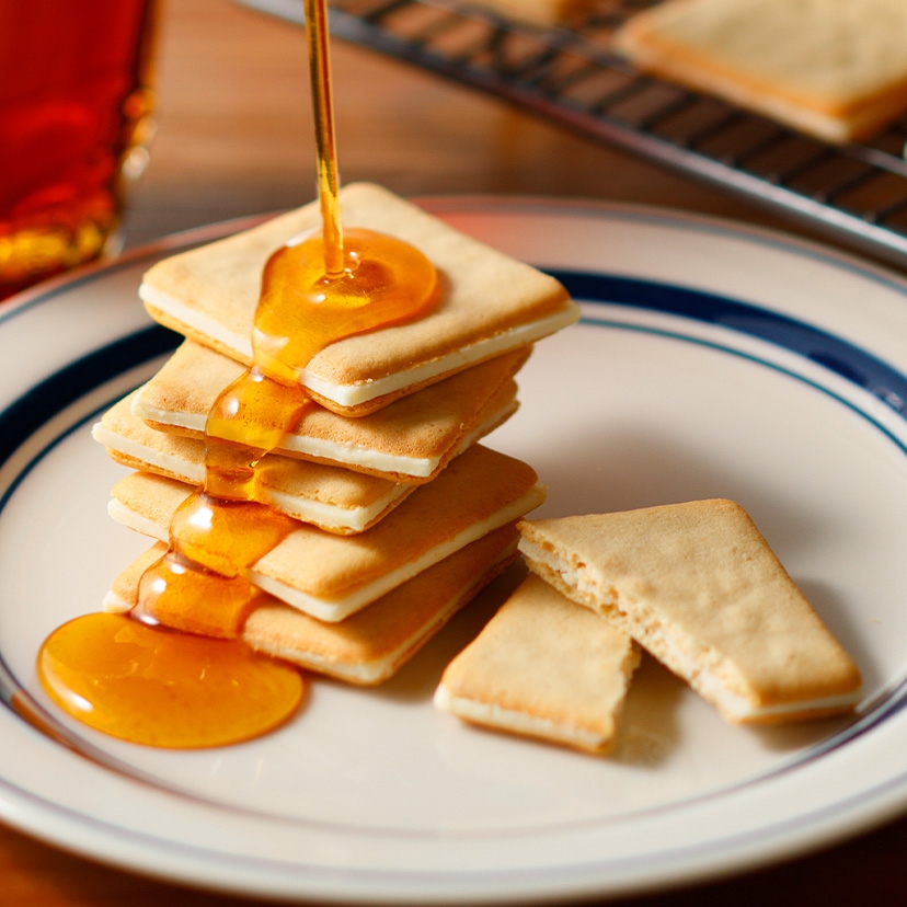 子どもの頃のワクワクを思い出す、メープルのやさしい味。「メープルバタークッキー」は、メープルシュガーを生地に練りこみ、サクサクと軽い食感に焼き上げたメープルマニア自慢のクッキーです。 仕上げにバターが香るチョコをサンドすることで、メープルのコクとさっぱりとした甘みを表現しました。