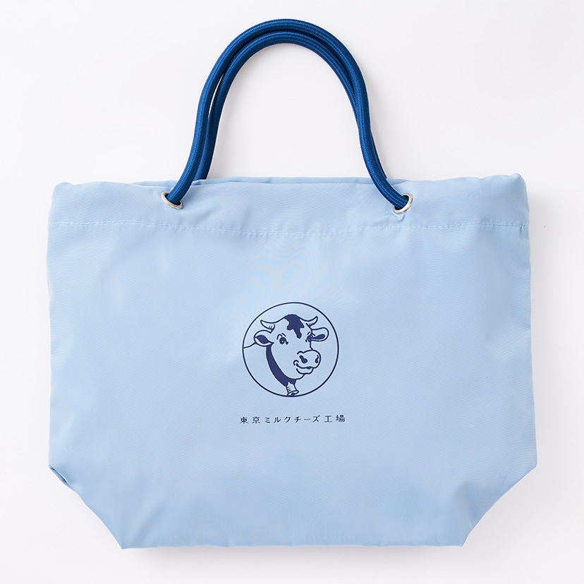 東京ミルクチーズ工場をイメージした水色の生地にブランドロゴが映える、洗練されたデザイン。ふわっと軽い素材で、ちょっとしたおでかけにもぴったりのバッグです。