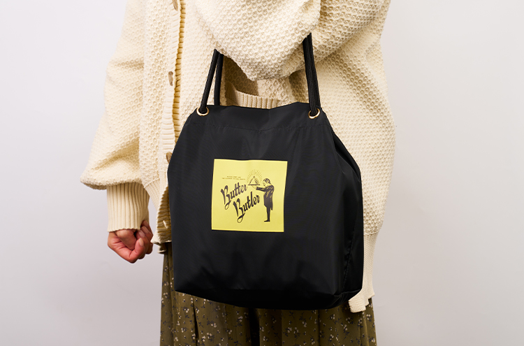 黒地にバターバトラーのブランドロゴが映える、洗練されたデザイン。ふわっと軽い素材で、ちょっとしたおでかけにもぴったりのバッグです。