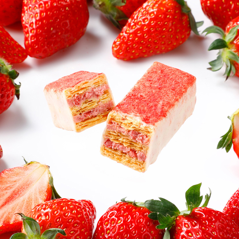甘みと酸味のバランスが絶妙ないちごクリームをパイでサンドし、ホワイトチョコレートで包みました。トッピングのいちごパウダーが、華やかな香りと彩りを添えます。
