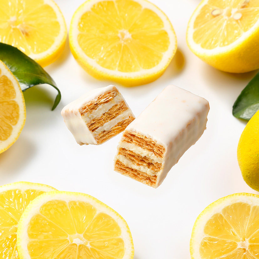 爽やかな香りと酸味の広がるレモンクリームをパイでサンドし、レモン味のコーティングチョコレートで包みました。クリームに加えたレモンピールがアクセントとして、ぐっと香りを引き立てます。