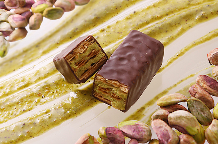 濃厚で奥深い味わいのピスタチオクリームをパイでサンドし、スイートチョコレートで包みました。