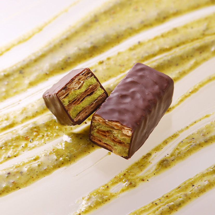 濃厚で奥深い味わいのピスタチオクリームをパイでサンドし、スイートチョコレートで包みました。ピスタチオの贅沢な香りとコクが口いっぱいに広がります。