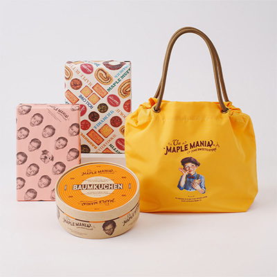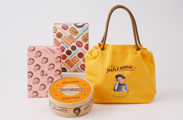 ザ・メープルマニアをイメージした温かみのあるオレンジ色の生地にブランドロゴが映える、洗練されたデザイン。