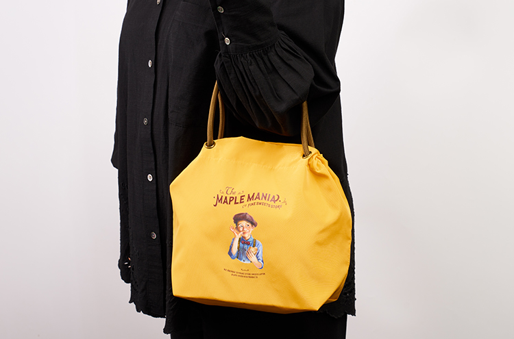 ザ・メープルマニアをイメージした温かみのあるオレンジ色の生地にブランドロゴが映える、洗練されたデザイン。ふわっと軽い素材で、ちょっとしたおでかけにもぴったりのバッグです。