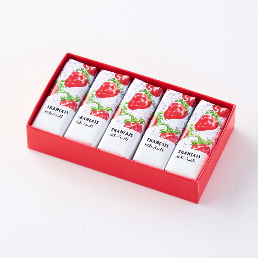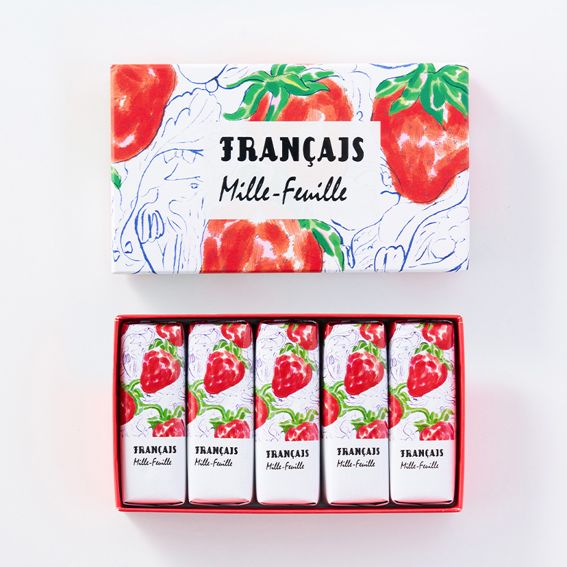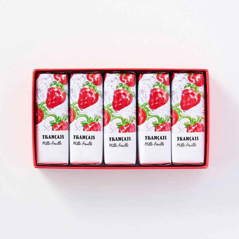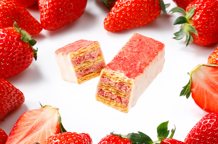 甘みと酸味のバランスが絶妙ないちごクリームをパイでサンドし、ホワイトチョコレートで包みました。トッピングのいちごパウダーが、華やかな香りと彩りを添えます。