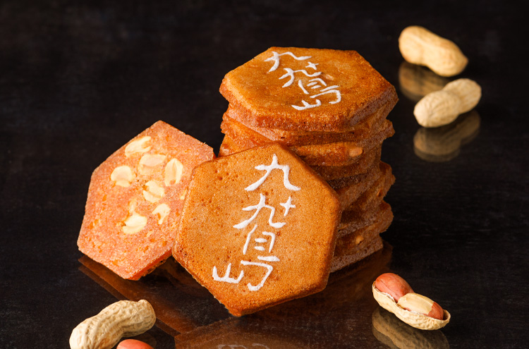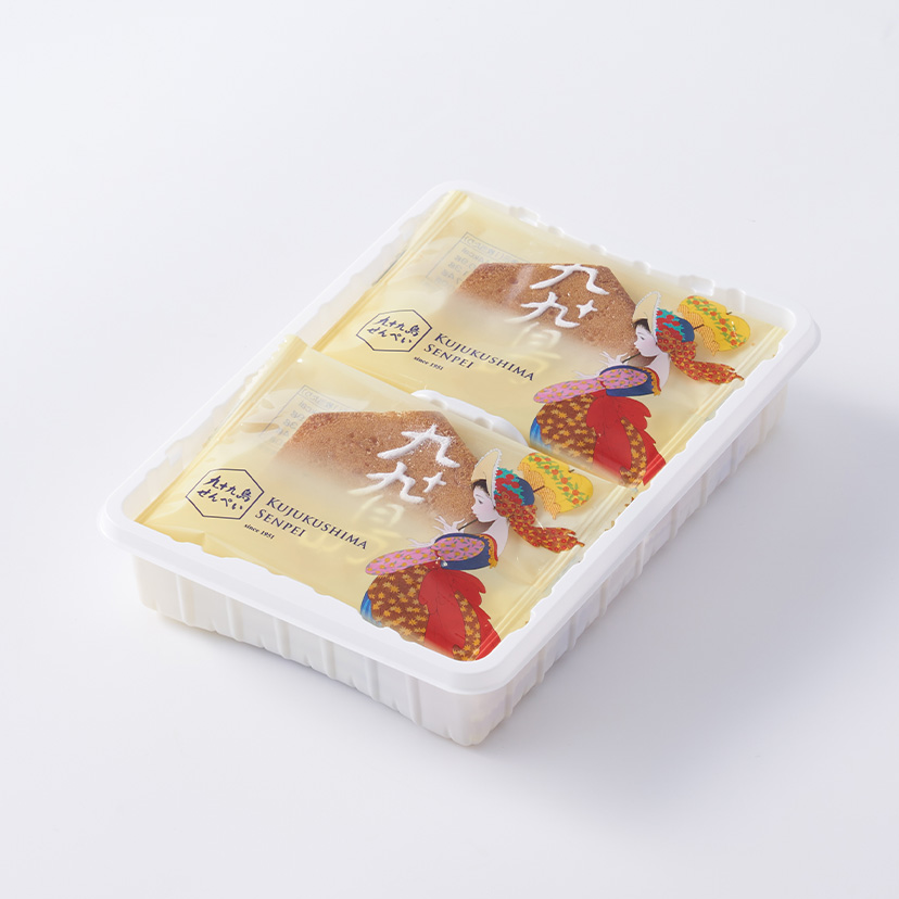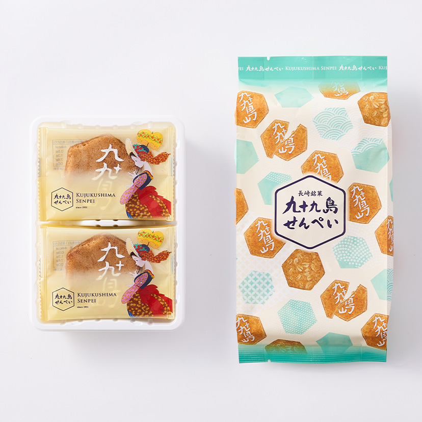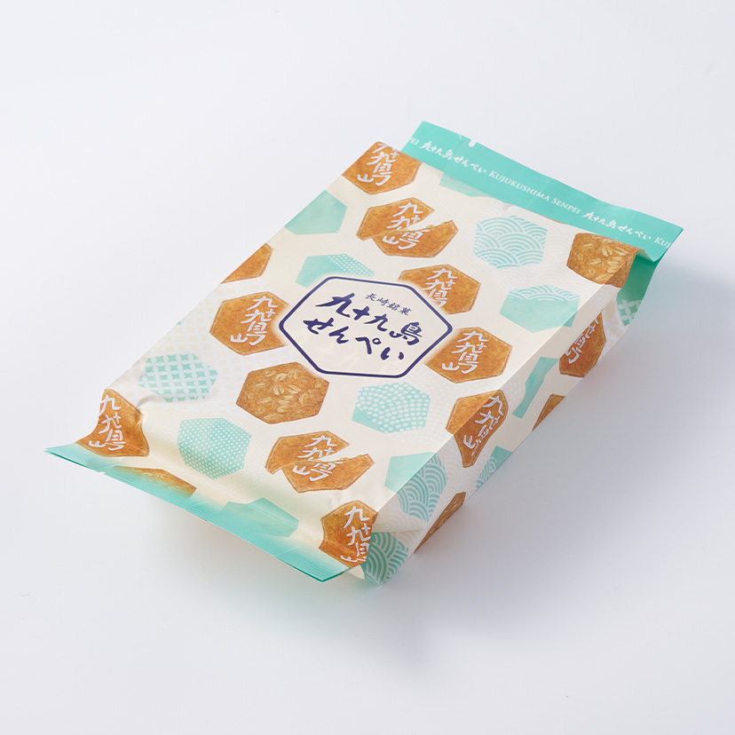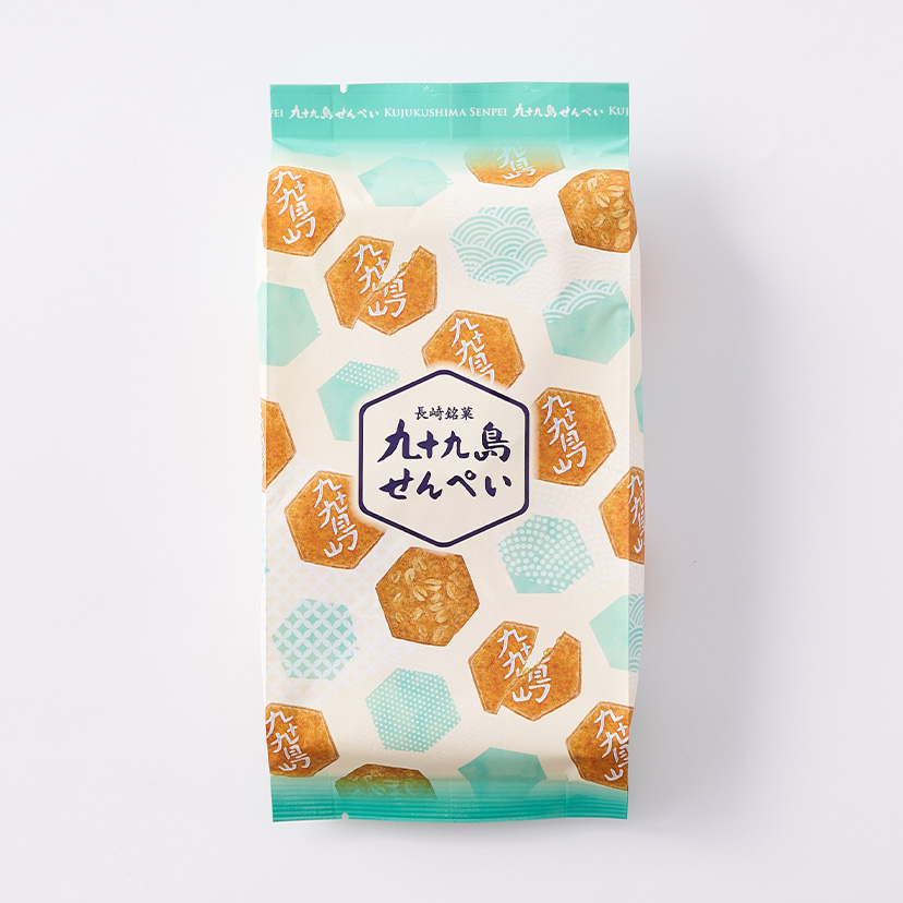 1951年の誕生以来、愛され続けている長崎銘菓『九十九島せんぺい』。 1953年には従来に無い歯切れの良さを生み出す独自の製法から製法特許を取得しました。 六角形のデザインは縁起物の亀の甲羅をかたどって海を表し、ピーナッツは九十九島の島影を表現しています。 厳選されたシンプルな素材から職人が作り出す伝統のおいしさをおたのしみください。