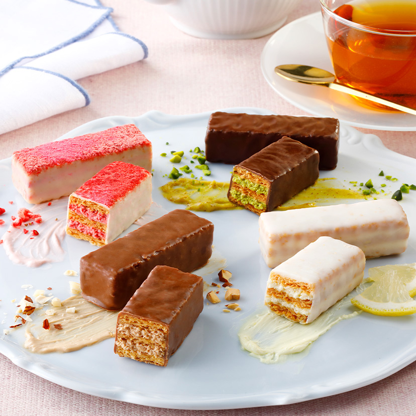 サクサクのパイでそれぞれのクリームをサンドしチョコレートでコーティングしました。