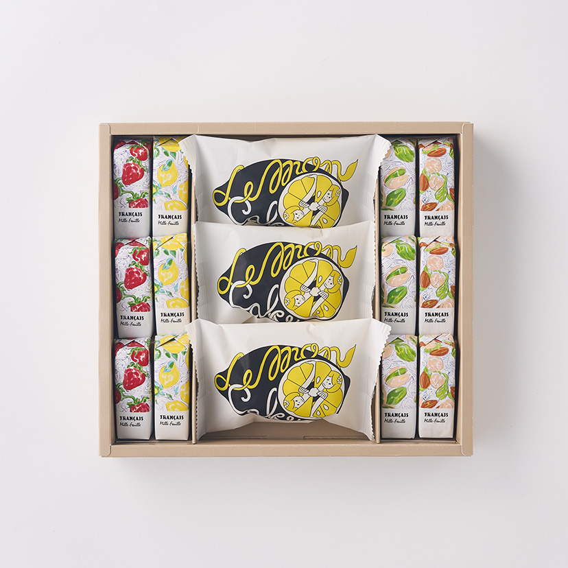 幾層にも重ねたサクサクのパイで“くだもの”や“木の実”のクリームをサンドした、定番人気4種の味が入った「果実をたのしむミルフィユ」。