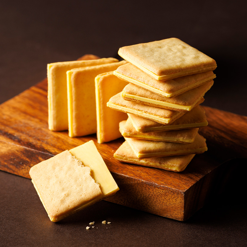 カスタードのような優しい味わいのチョコ※を、薄く焼きあげたクッキーでサンドしました。