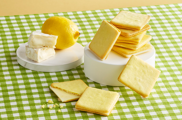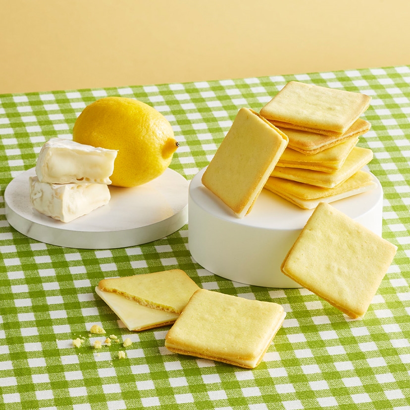北海道産牛乳とレモンを合わせたクッキー生地に、カマンベールチーズのチョコ※をサンドしたクッキーです。カマンベールのコクとレモンの爽やかな味わいをお楽しみください。