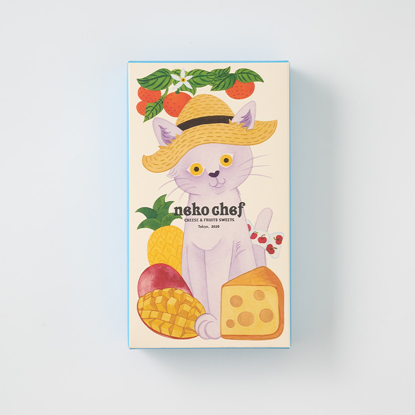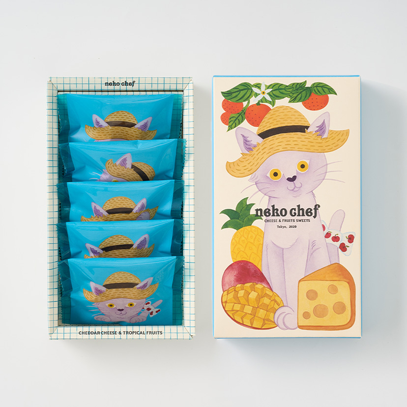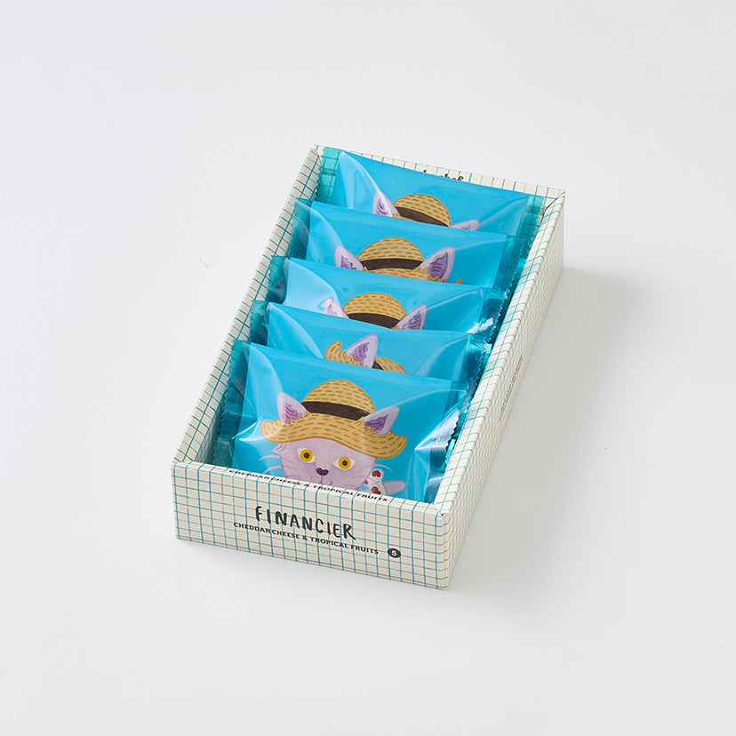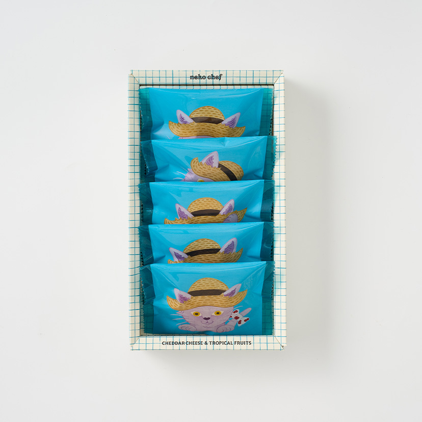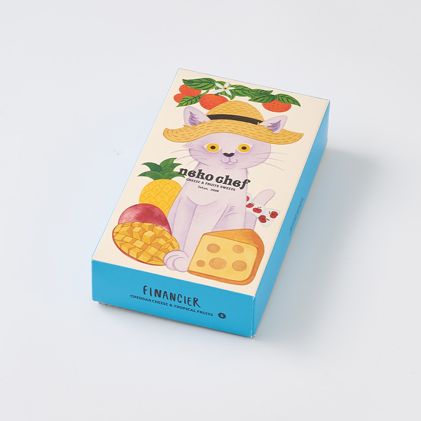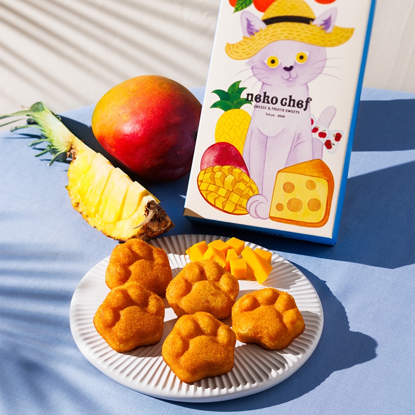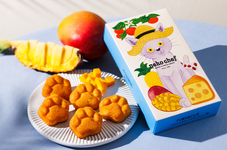 チェダーチーズを練り込んだ生地に、パインやマンゴーなどトロピカルフルーツの爽やかな風味とオレンジピールを忍ばせ、 肉球のかたちにしっとりと焼き上げました。ココナッツのシャリッとした食感が、さりげないアクセントに。 甘さと塩味、チーズのコクとフルーツの爽やかさが心地よく重なる、ネコシェフこだわりのフィナンシェです。 ※チーズパウダー中チェダー60%使用
