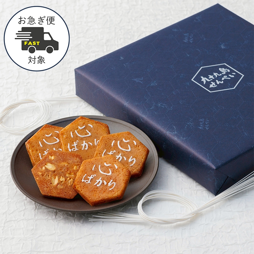 創業1948年。ピーナッツを九十九島の島々にみたて、パリッと香ばしく焼き上げた長崎銘菓「九十九島せんぺい」に心ばかりの文字を描き、シックな装いの限定パッケージにてご用意いたしました。「お礼」「季節のごあいさつ」「仏事の返礼品」など様々なシーンでご利用いただける贈り物としておすすめです。