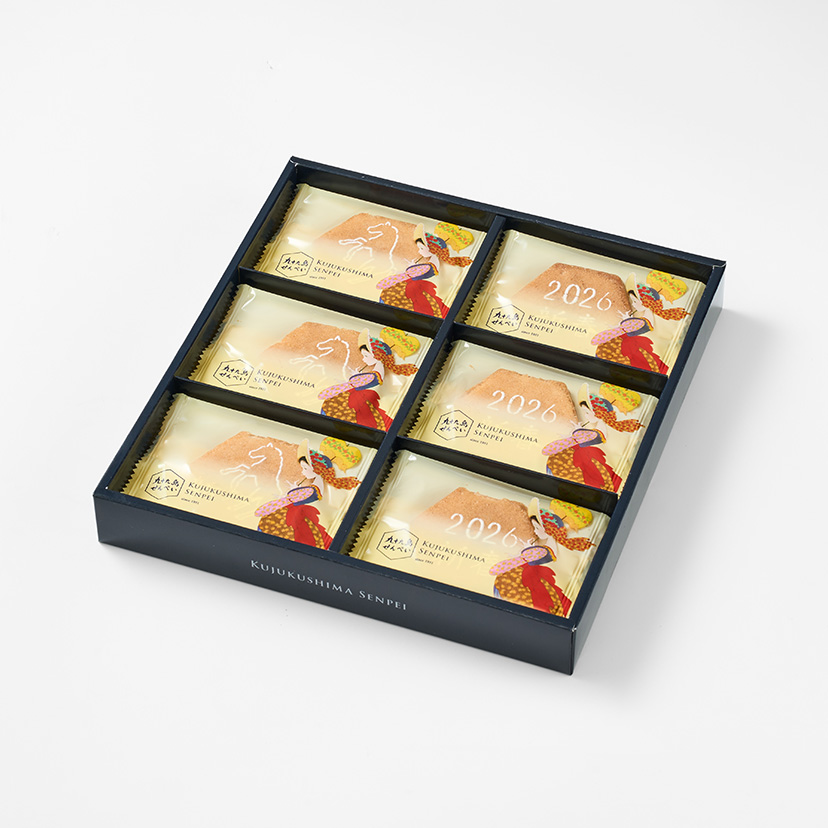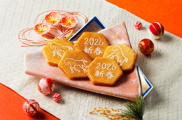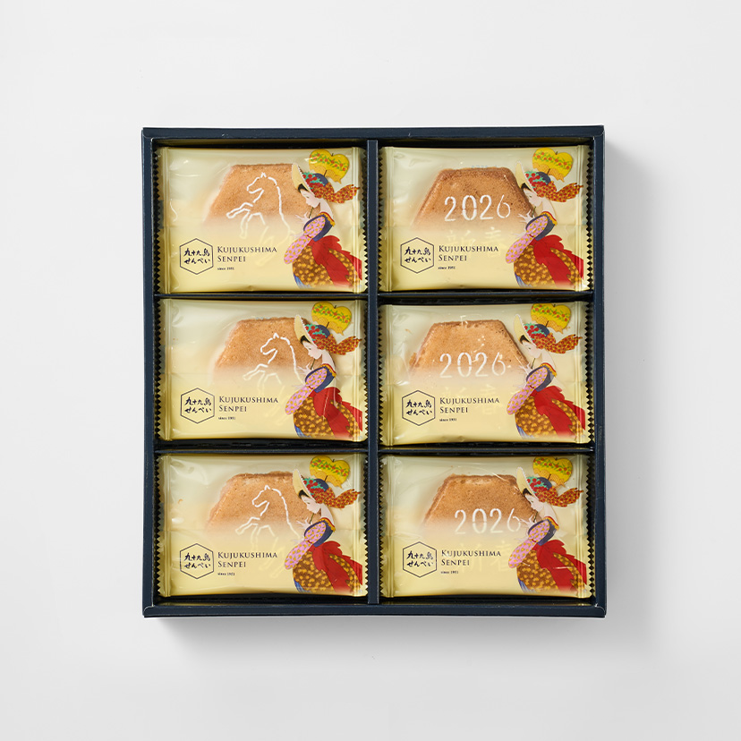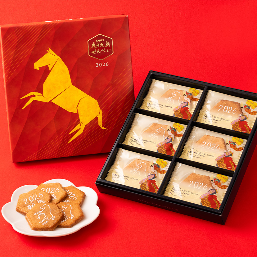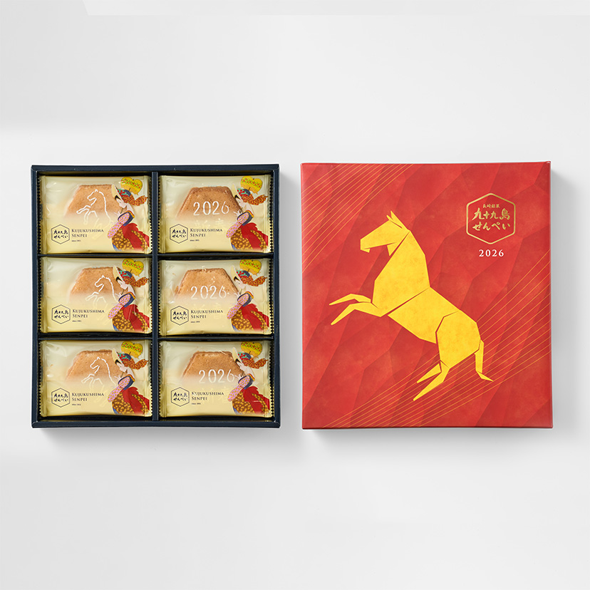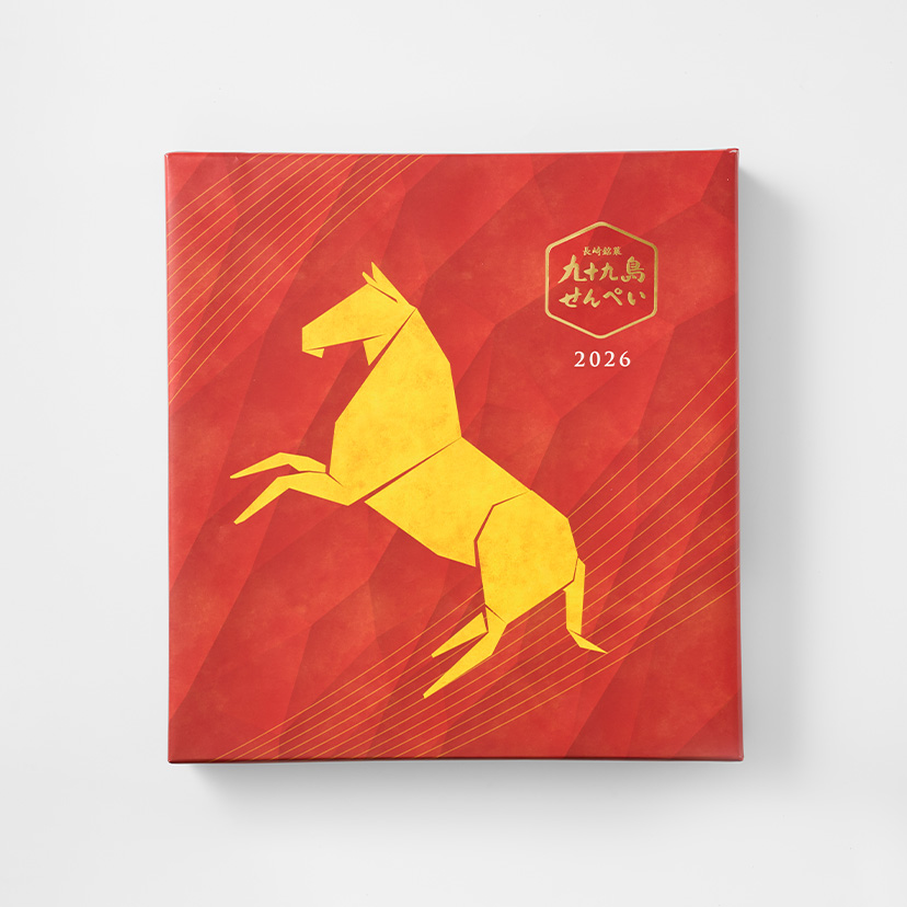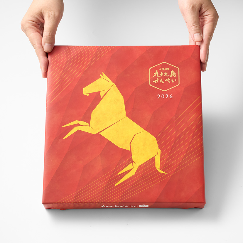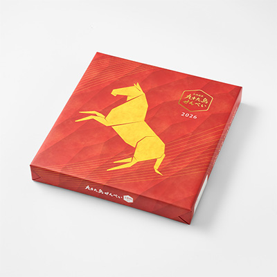 2026年新春にむけて、新しい1年を祝うにふさわしい「九十九島干支せんぺい18枚入」をご用意いたしました。 干支・午をモチーフにした縁起の良いパッケージと、2種の限定絵柄のりんがけなど、この時期ならではの装いをお楽しみいただけます。
