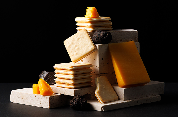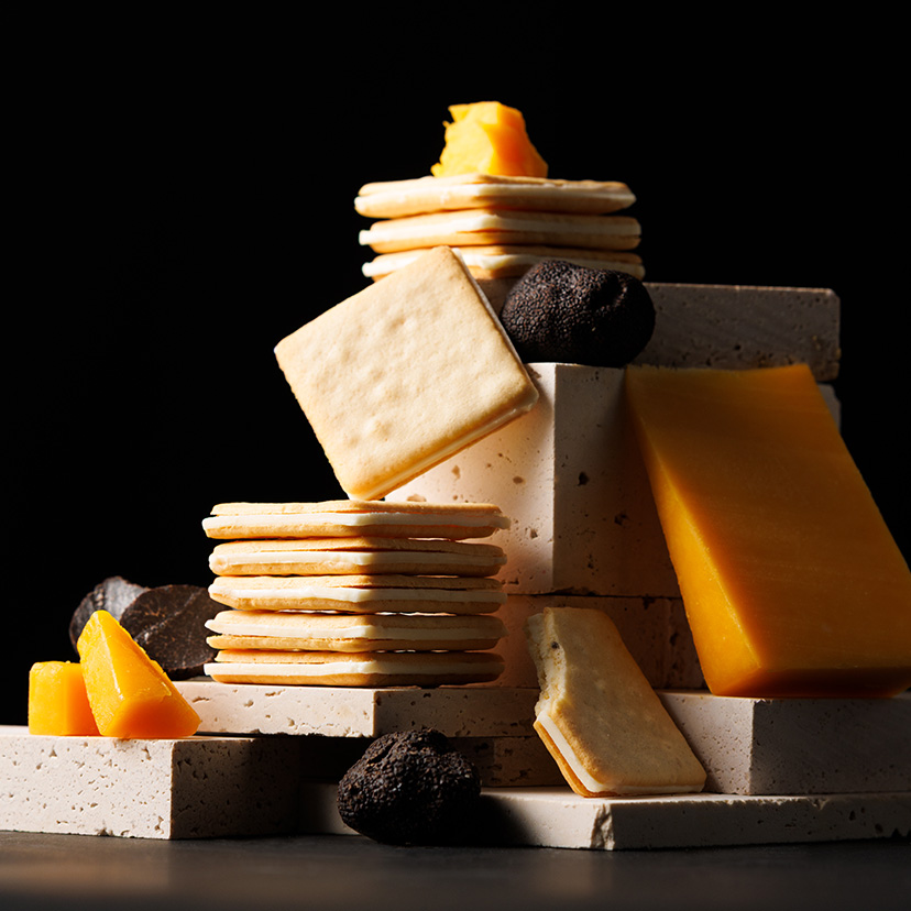 北海道産牛乳とチェダーチーズ、トリュフを混ぜ込んだクッキーに、トリュフ風味の※チョコレートプレートをサンドしました。