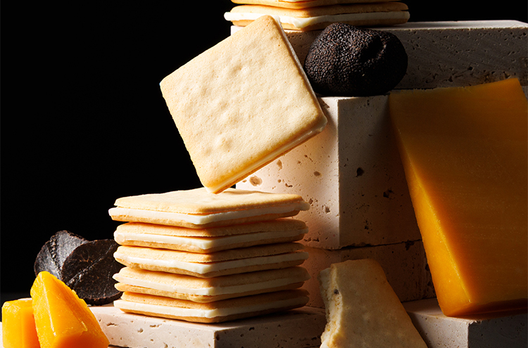 北海道産牛乳とチェダーチーズ、トリュフを混ぜ込んだクッキーに、トリュフ風味の※チョコレートプレートをサンドしました。