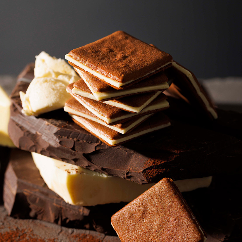 エスプレッソを効かせた生地で、マスカルポーネチーズのチョコ※をサンドしました。 本物のティラミスを凝縮して焼き上げたような濃厚な味わいのクッキーです。 (チーズ中マスカルポーネ98%使用) ※チョコレートコーチングを使用