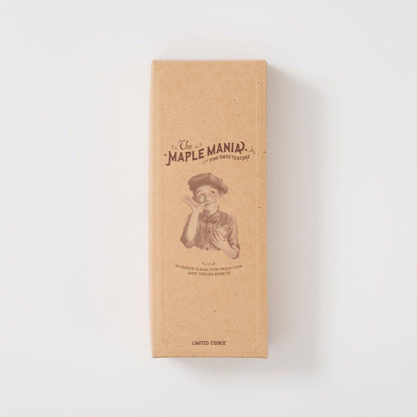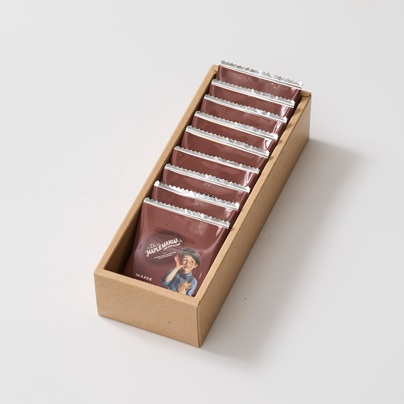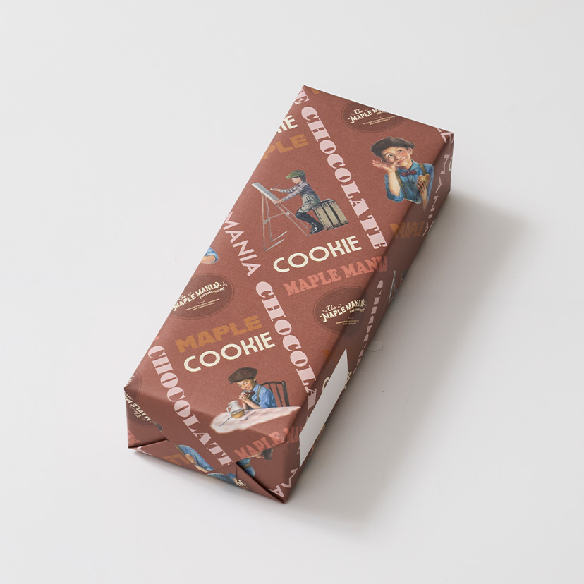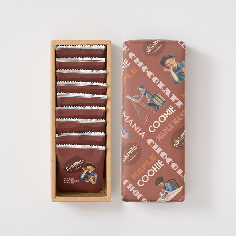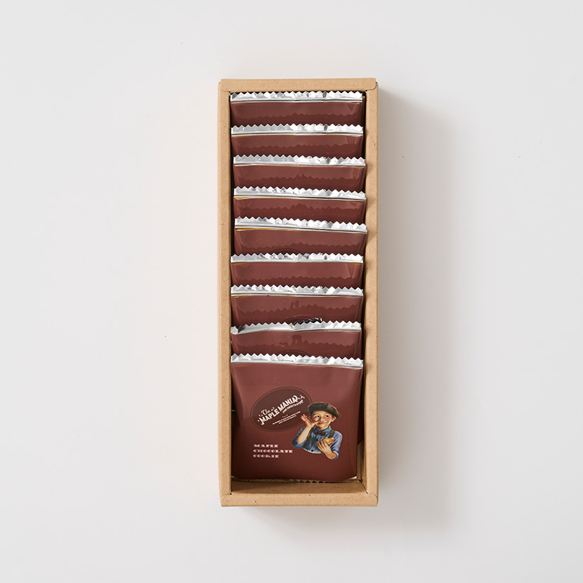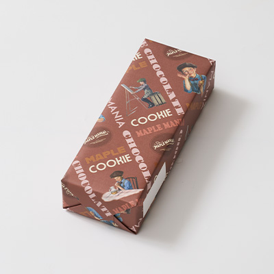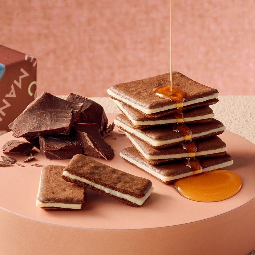 メープルシュガーとココアパウダーを練り込んでサクサクと軽い食感に焼き上げたクッキーで、マスカルポーネチーズのまろやかな味わいのチョコ※をサンドしました。 メープルを引き立たせるために、香り豊かな味わいとほろ苦い味わいの2種類のココアパウダーを合わせて仕上げました。 ※チョコレートコーチングを使用