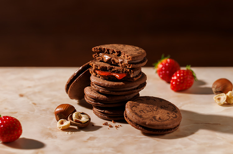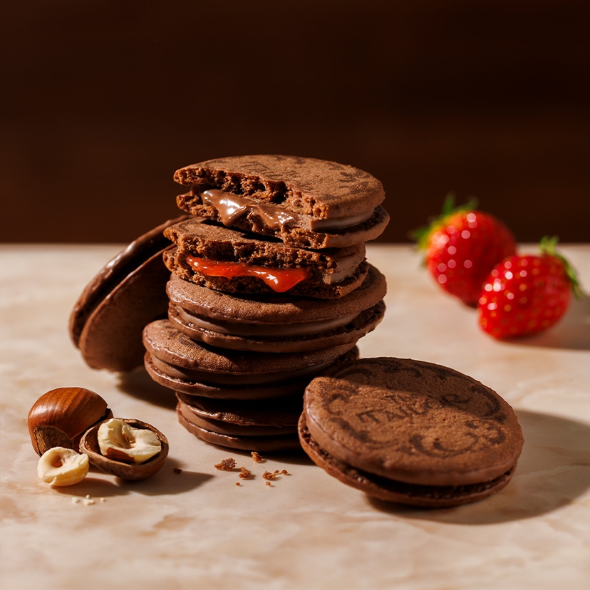 甘酸っぱいストロベリーソースをフランス製のミルクチョコレートで包み込み、サクッと焼き上げたココアクッキーでサンドしました。